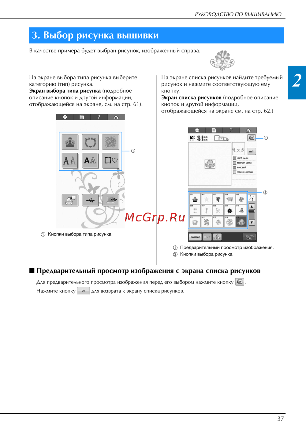 - Эта глава содержит описание способов выполнения различных операций вышивания создания привлекательных вышивок а также подробную информацию об обслуживании машины и корректирующих действиях которые должны предприниматься при возникновении различных проблем p.155