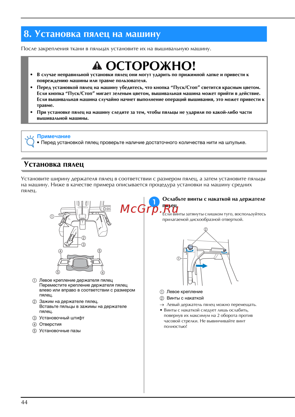 • Перед установкой пялец на машину убедитесь, что кнопка “Пуск/Стоп” светится красным цветом.