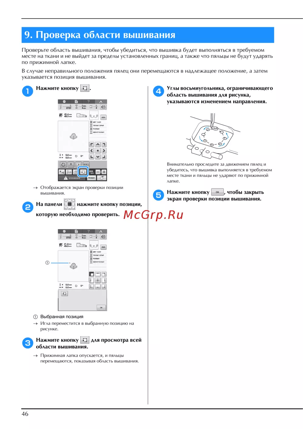 - Проверка области вышивания 46 10 заправка верхней нити 47 p.12