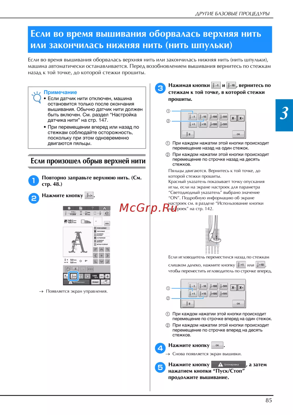 Узнайте, как правильно продолжить вышивание после обрыва верхней или нижней нити. Пошаговая инструкция по настройке и перемещению игловодителя.