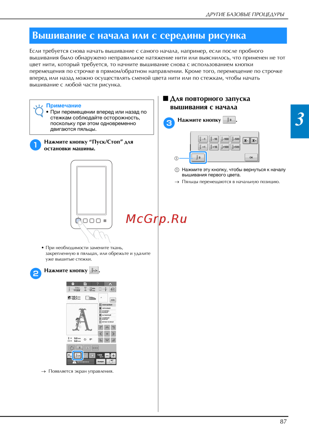 Если требуется снова начать вышивание с самого начала, например, если после пробного