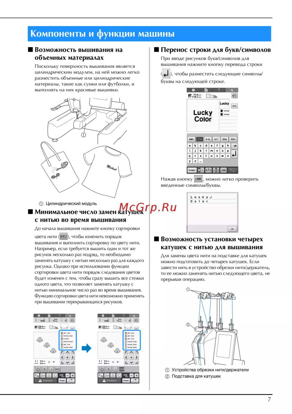 - Возможность установки четырех катушек с нитью для вышивания p.9