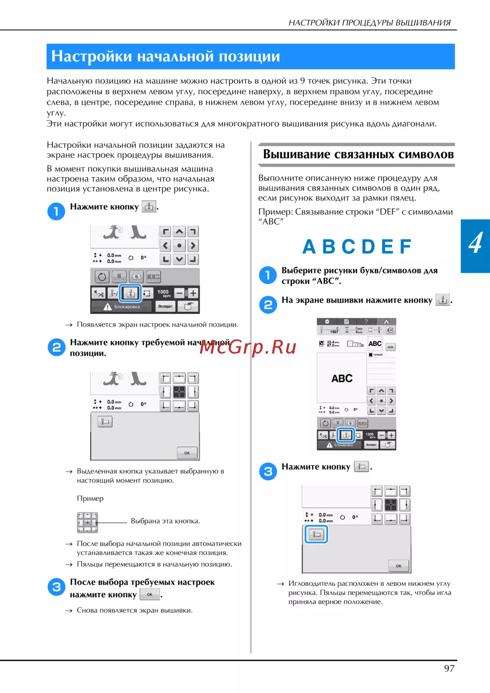 Узнайте, как настроить начальную позицию вышивания на машине и вышивать связанные символы. Подробные инструкции и советы для качественного результата.
