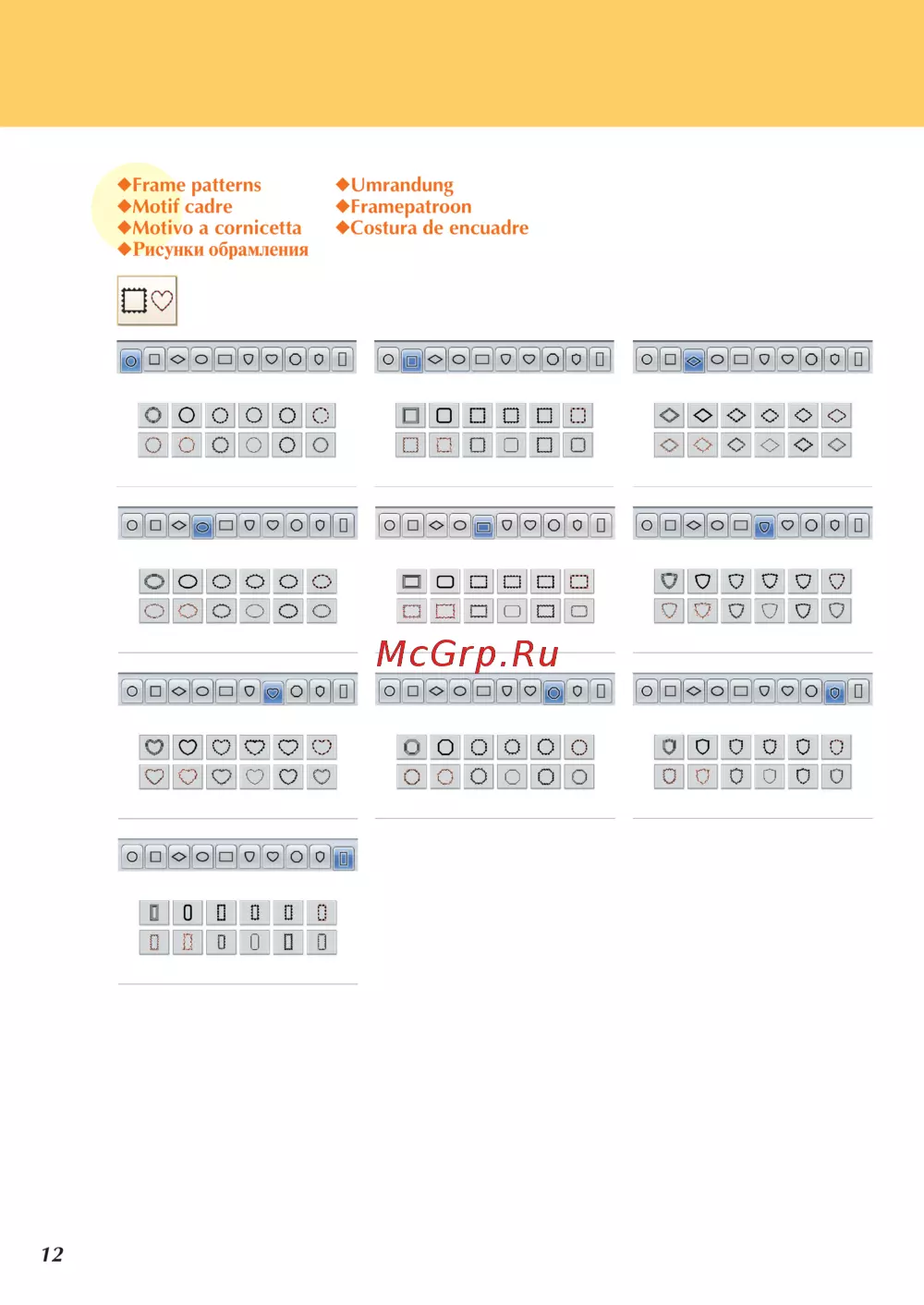- Der optionale randmuster stickrahmen hilft ihnen beim sticken von wiederholten mustern mit ihm ist es leichter den stoff aus und wieder einzuspannen ohne den rahmen von der maschine abzunehmen p.53