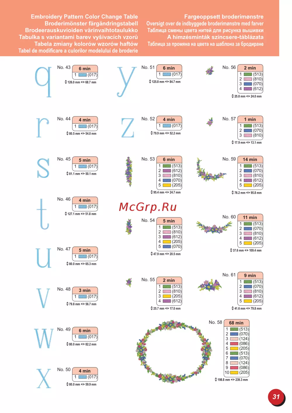 - Embroidery pattern color change table broderimönster färgändringstabell brodeerauskuvioiden värinvaihtotaulukko tabulka s variantami barev vyšívacích vzorů tabela zmiany kolorów wzorów haftów p.31
