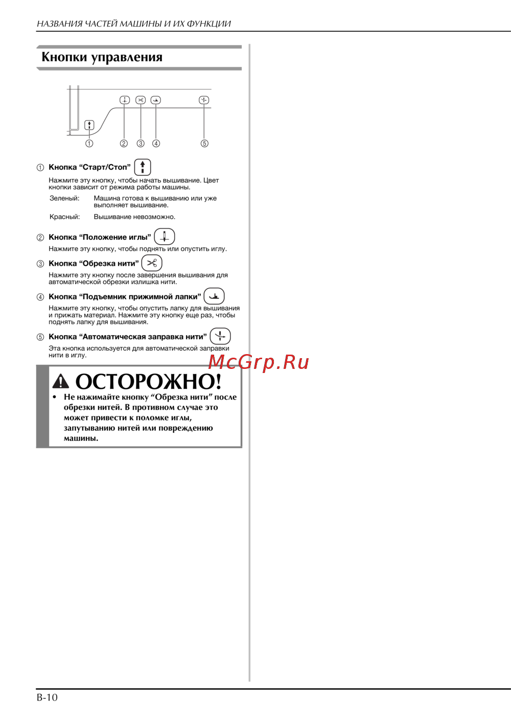 • Не нажимайте кнопку “Обрезка нити” после