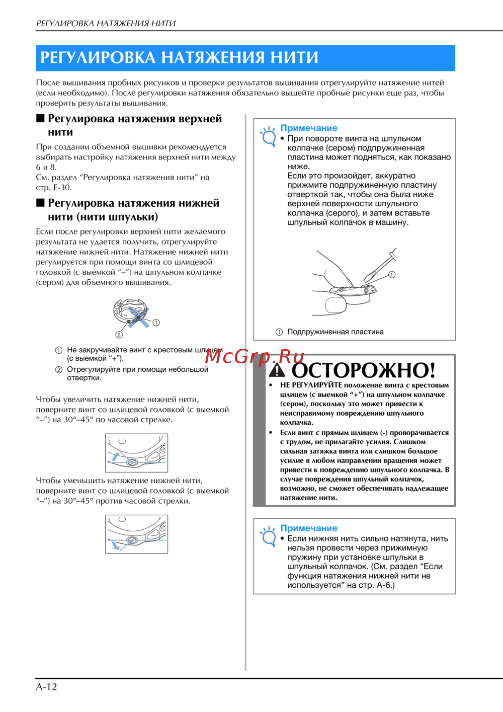 - Регулировка натяжения нижней нити нити шпульки p.162