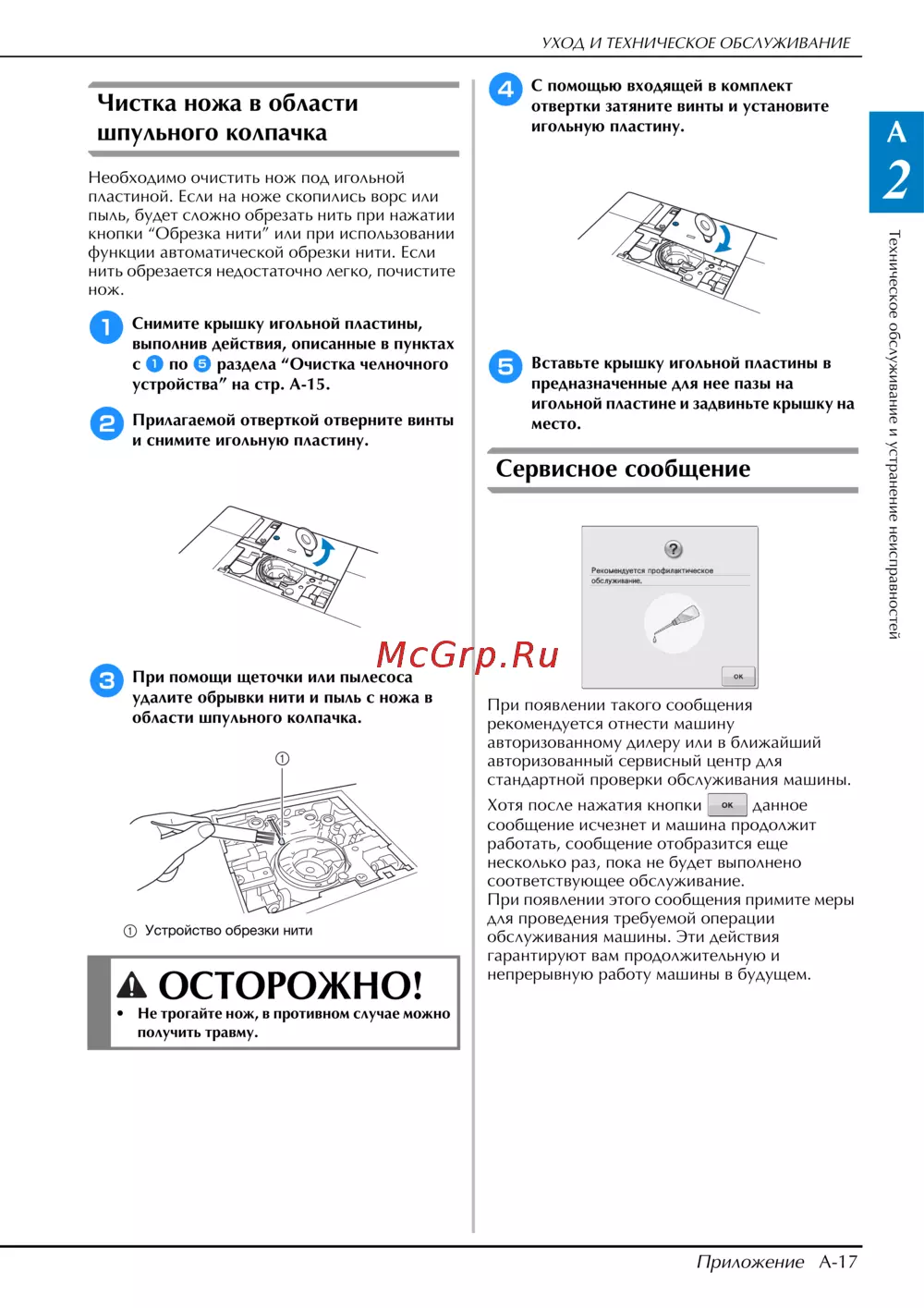 - Щеточкой или пылесосом удалите обрывки нитей и пыль с челнока датчика нити шпульки и с окружающих их поверхностей p.166