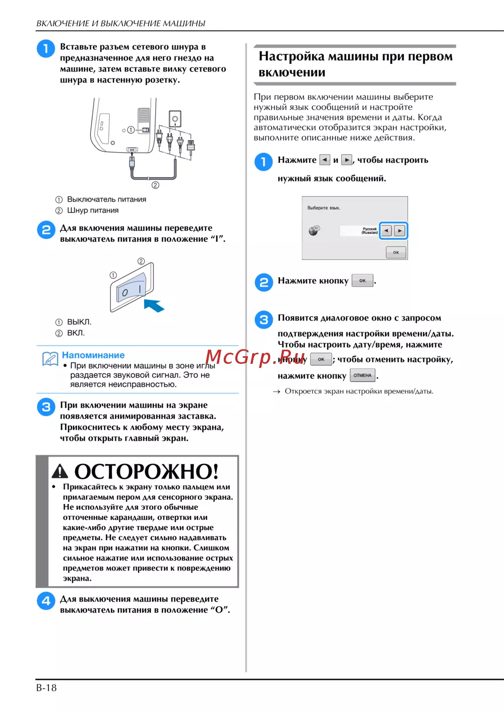 Узнайте, как правильно включить и настроить машину B-18. Следуйте простым шагам для выбора языка и установки времени. Обратите внимание на важные рекомендации.