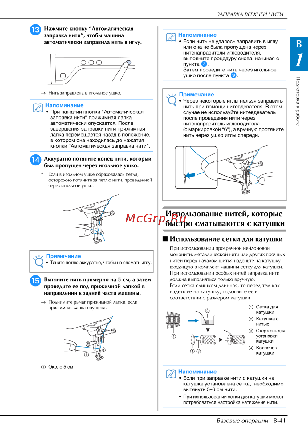 - Для получения наилучших результатов наматывайте нить на шпульку так чтобы она располагалась удобно и не перекручивалась p.155