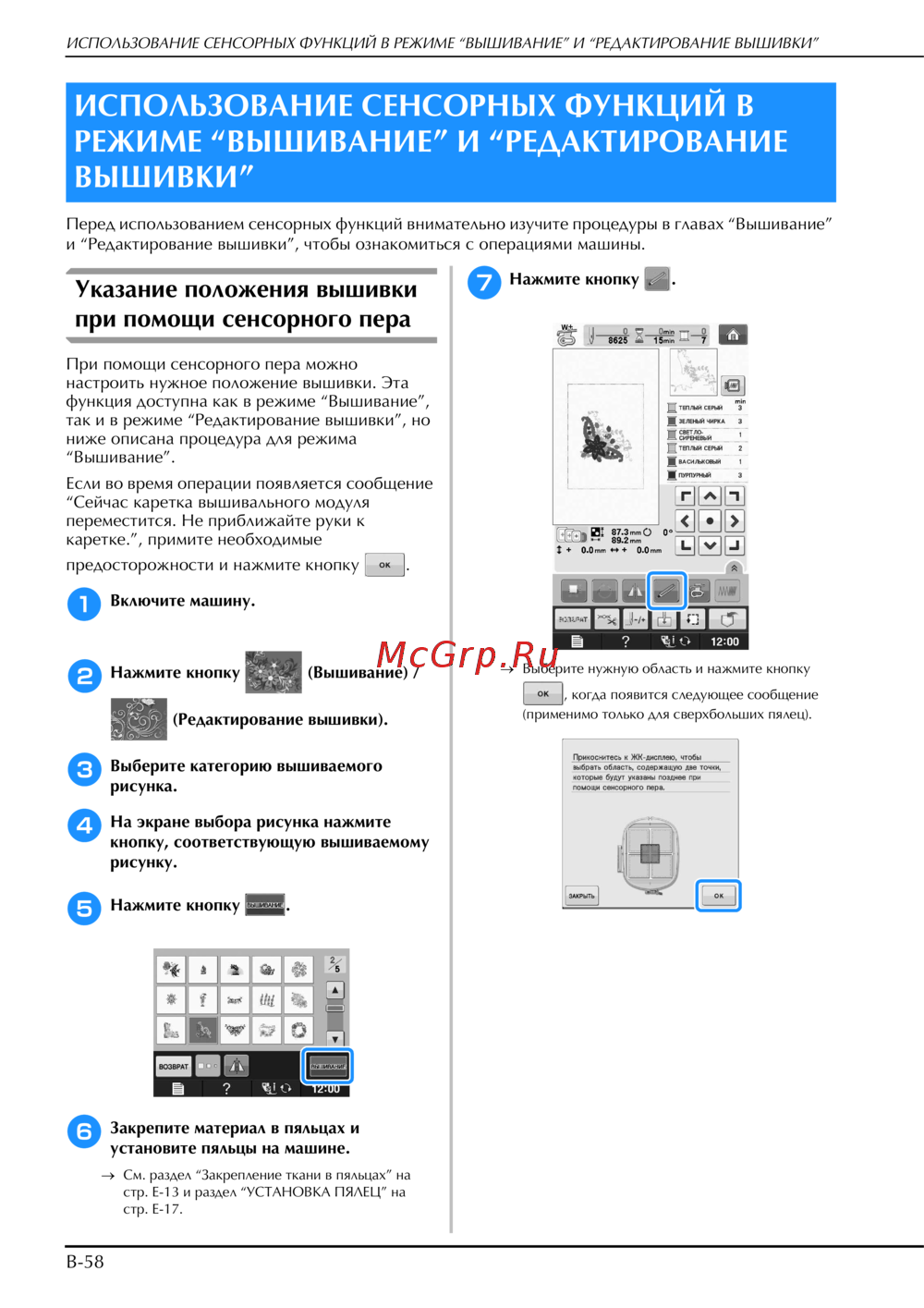 Перед использованием сенсорных функций внимательно изучите процедуры в главах “Вышивание”