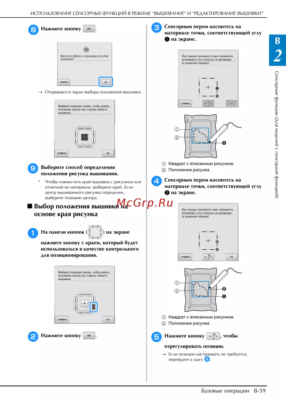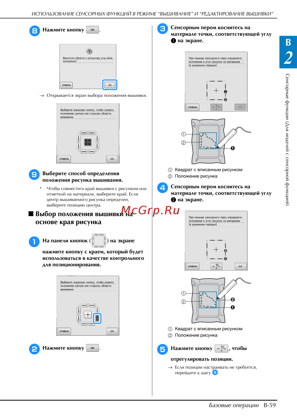 - Использование сенсорных функций в режиме вышивание и редактирование вышивки 58 p.8