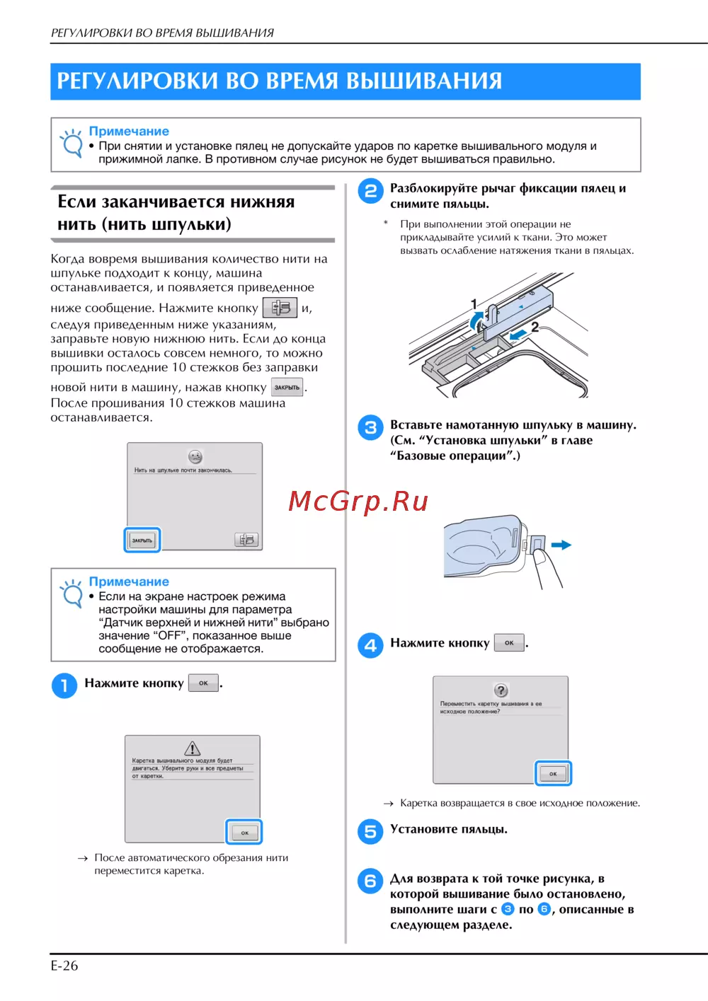 • При снятии и установке пялец не допускайте ударов по каретке вышивального модуля и