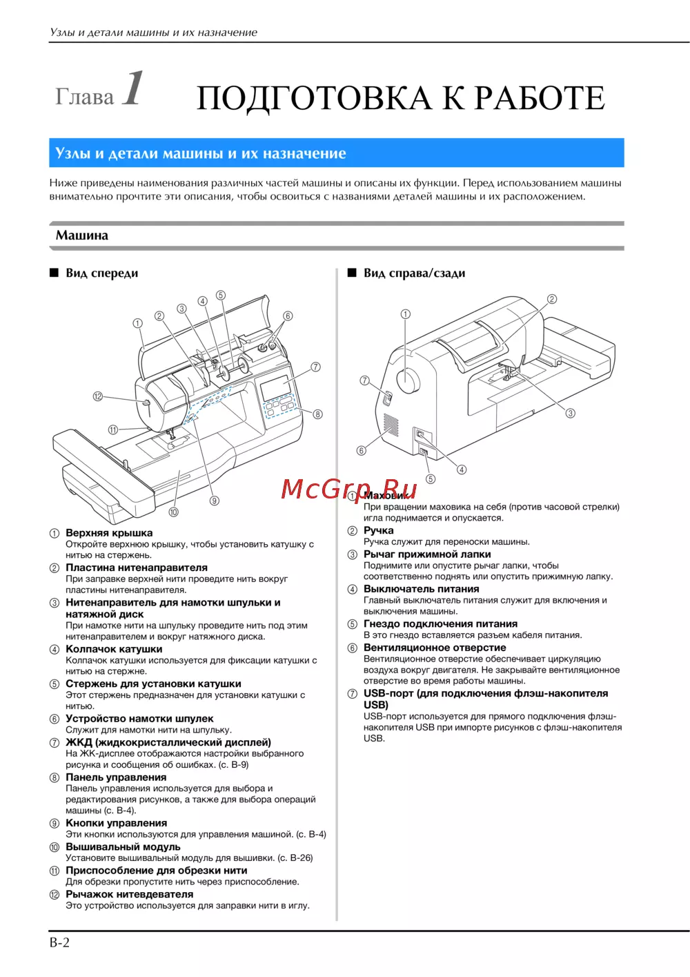 внимательно прочтите эти описания, чтобы освоиться с названиями деталей машины и их расположением.