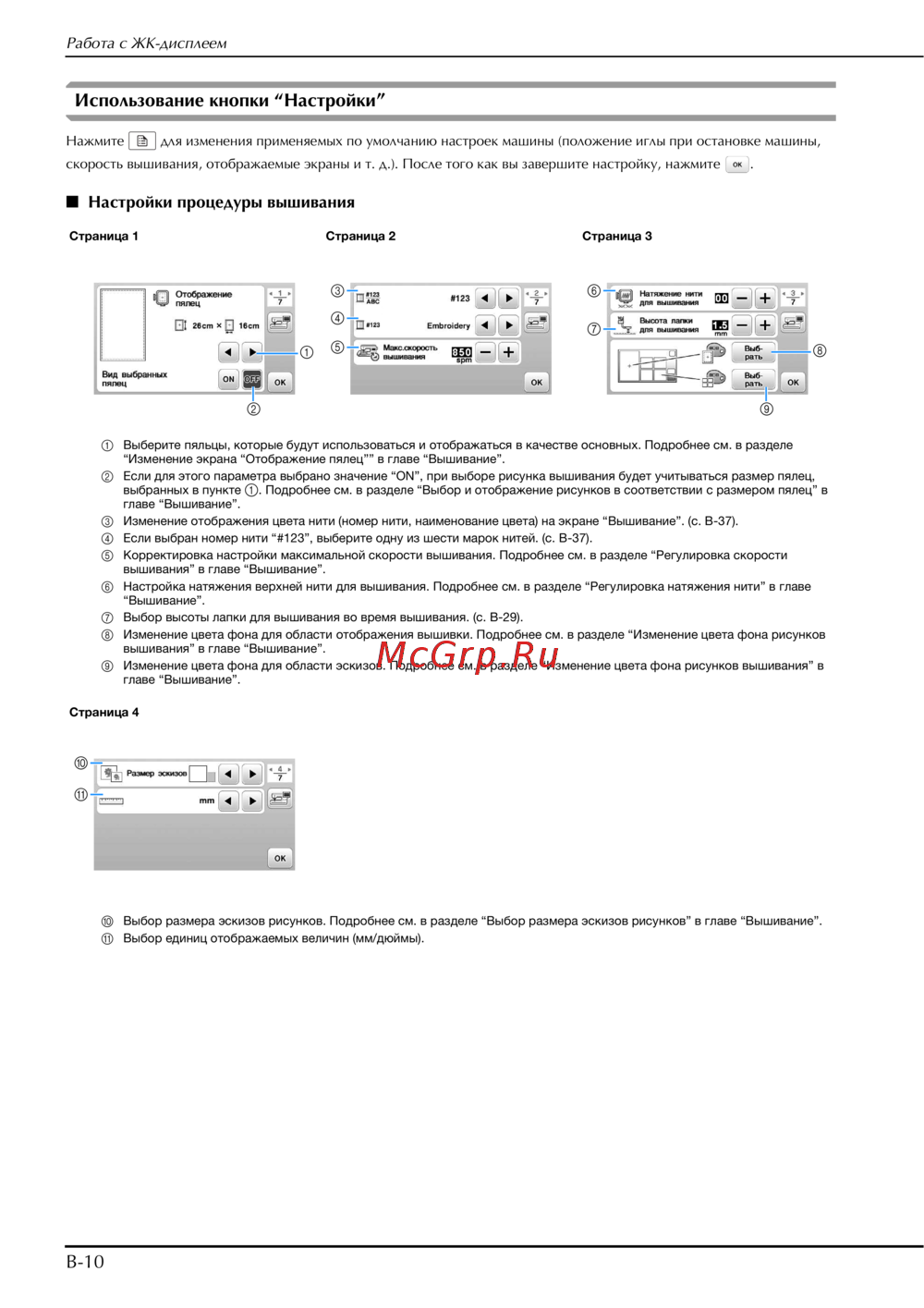 3 Изменение отображения цвета нити (номер нити, наименование цвета) на экране “Вышивание”. (с. B-37).