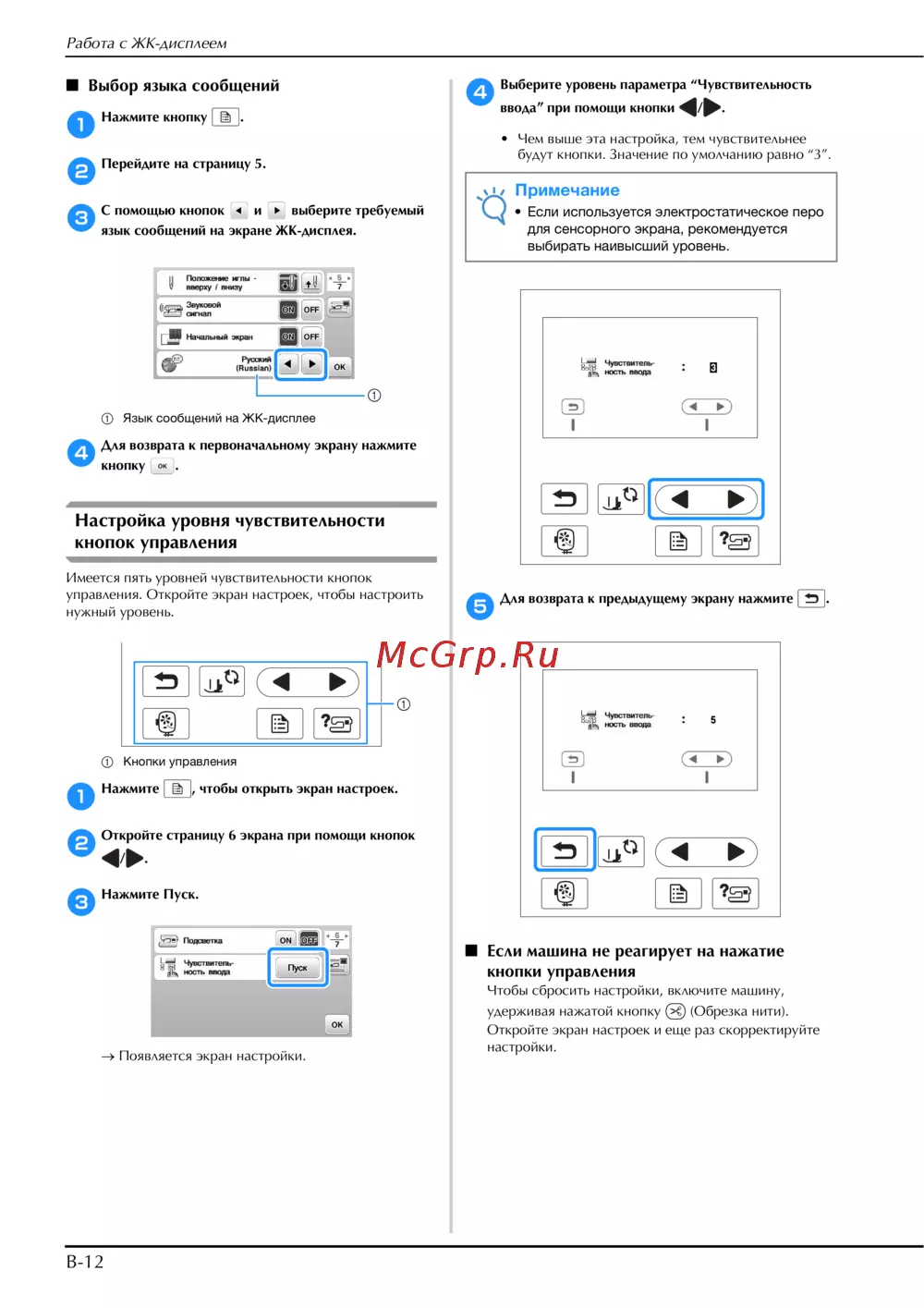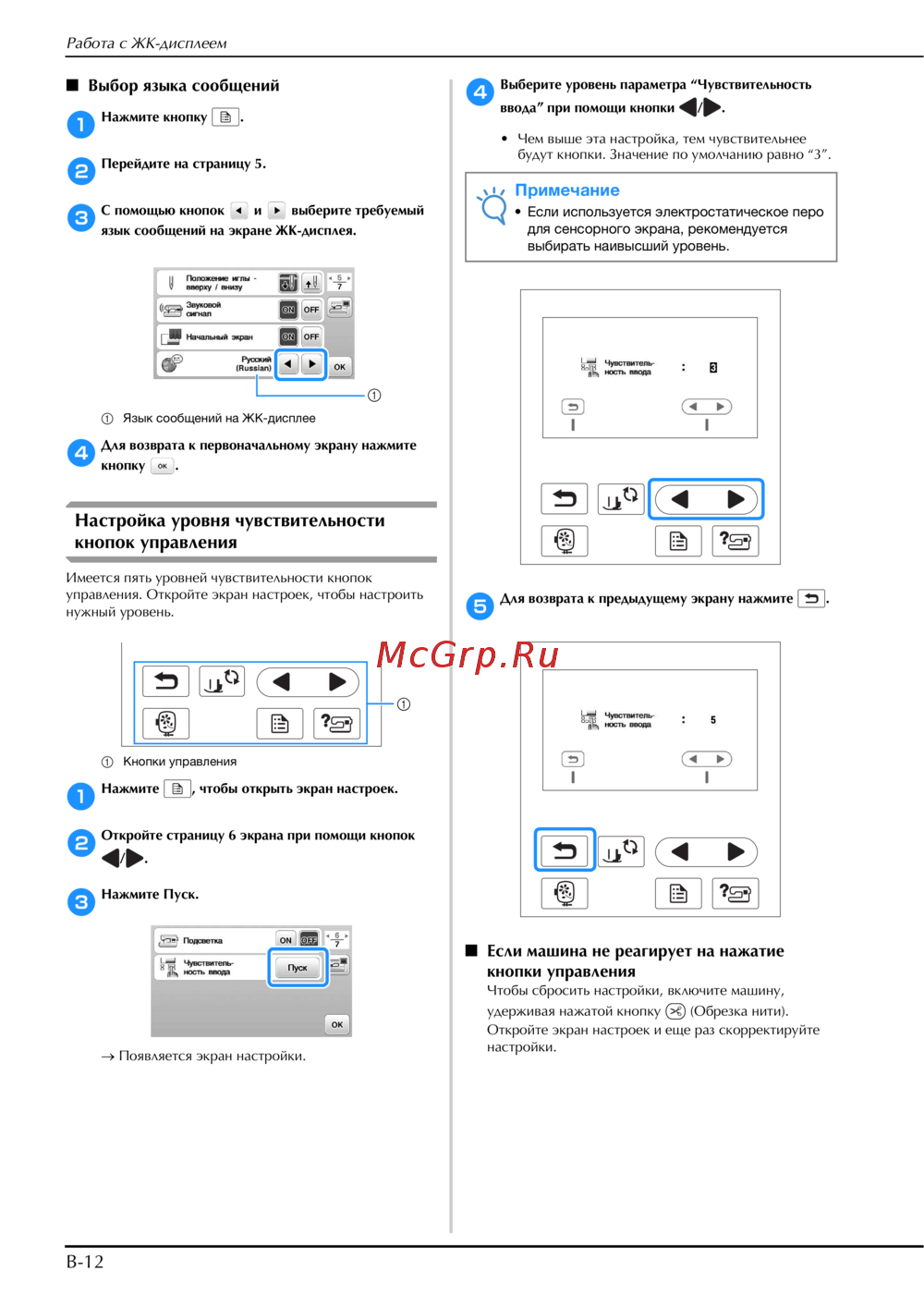Brother INNOV-'IS NV-800E — настройка ЖК-дисплея: выбор языка и чувствительности кнопок [22/100]