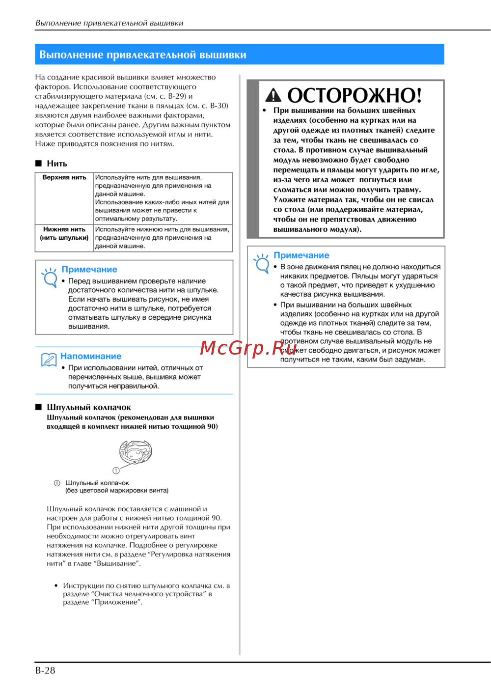 - Запрещается использовать шпульный колпачок если на нем имеются царапины так как это может привести к запутыванию верхней нити поломке иглы или ухудшению характеристик машины новый шпульный колпачок можно приобрести в ближайшем авторизованном сервисном центре brother убедитесь в правильной установке шпульного колпачка в противном случае возможна поломка иглы p.88