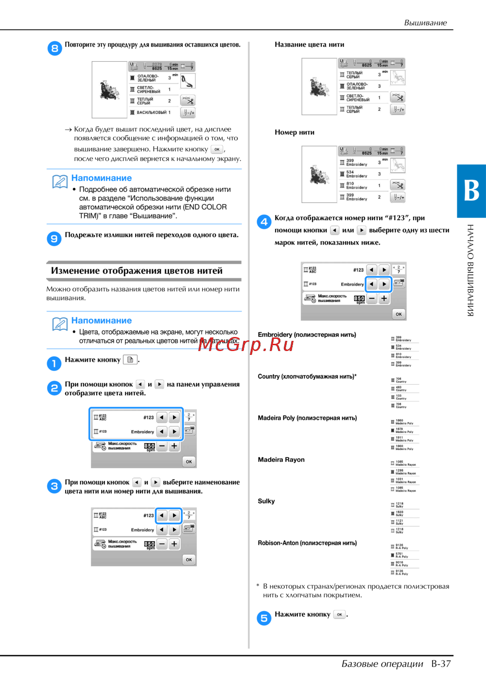 Изучите базовые операции вышивания, включая выбор цветов нитей и завершение работы. Узнайте, как правильно обрезать нити и использовать функции управления.