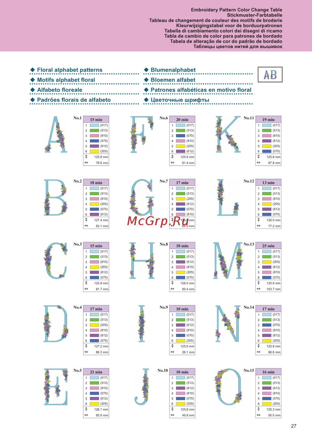 - Embroidery pattern color change table stickmuster farbtabelle tableau de changement de couleur des motifs de broderie kleurwijzigingstabel voor de borduurpatronen tabella di cambiamento colori dei disegni di ricamo tabla de cambio de color para patrones de bordado tabela de alteração de cor do padrão de bordado таблицы цветов нитей для вышивок p.27