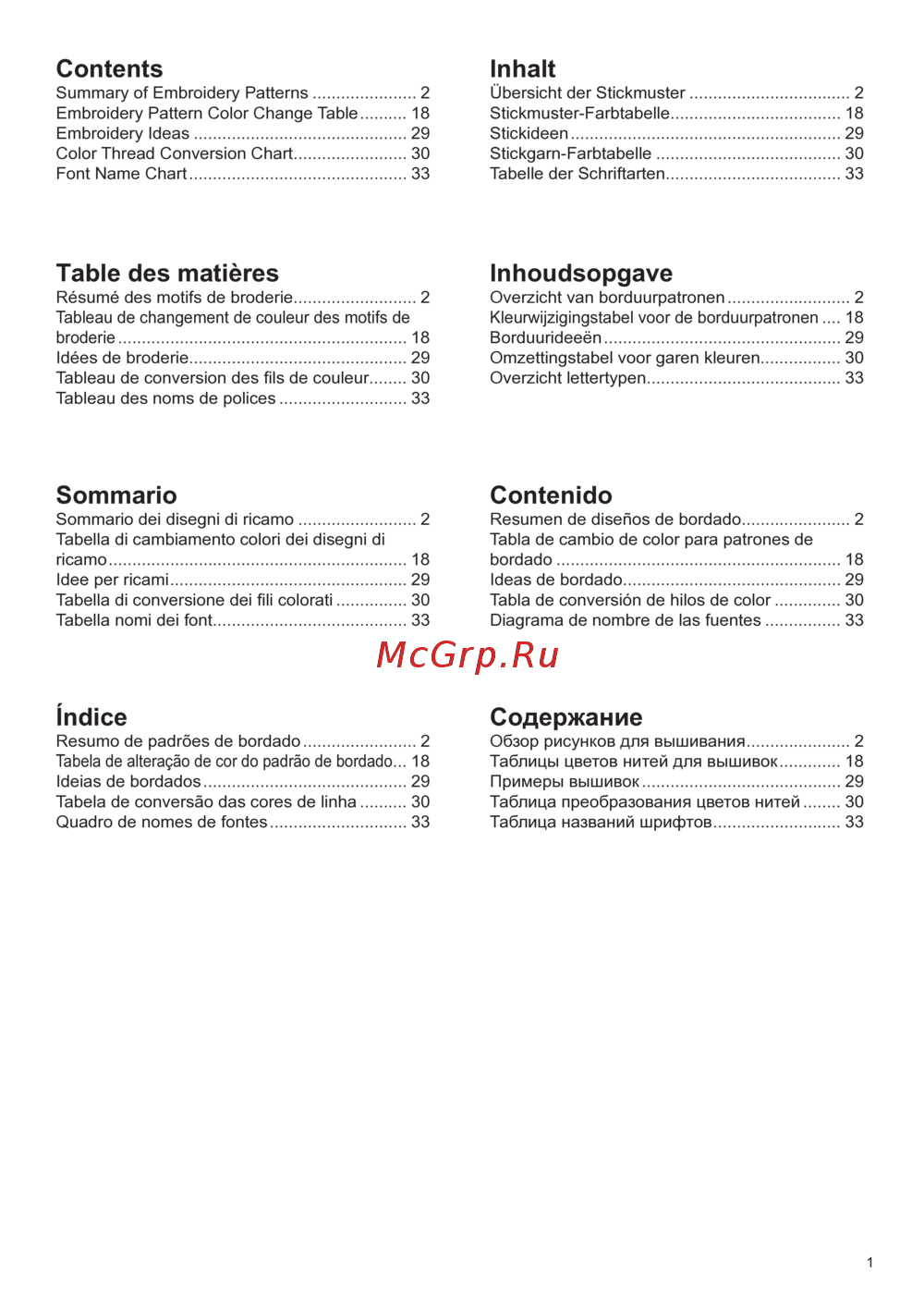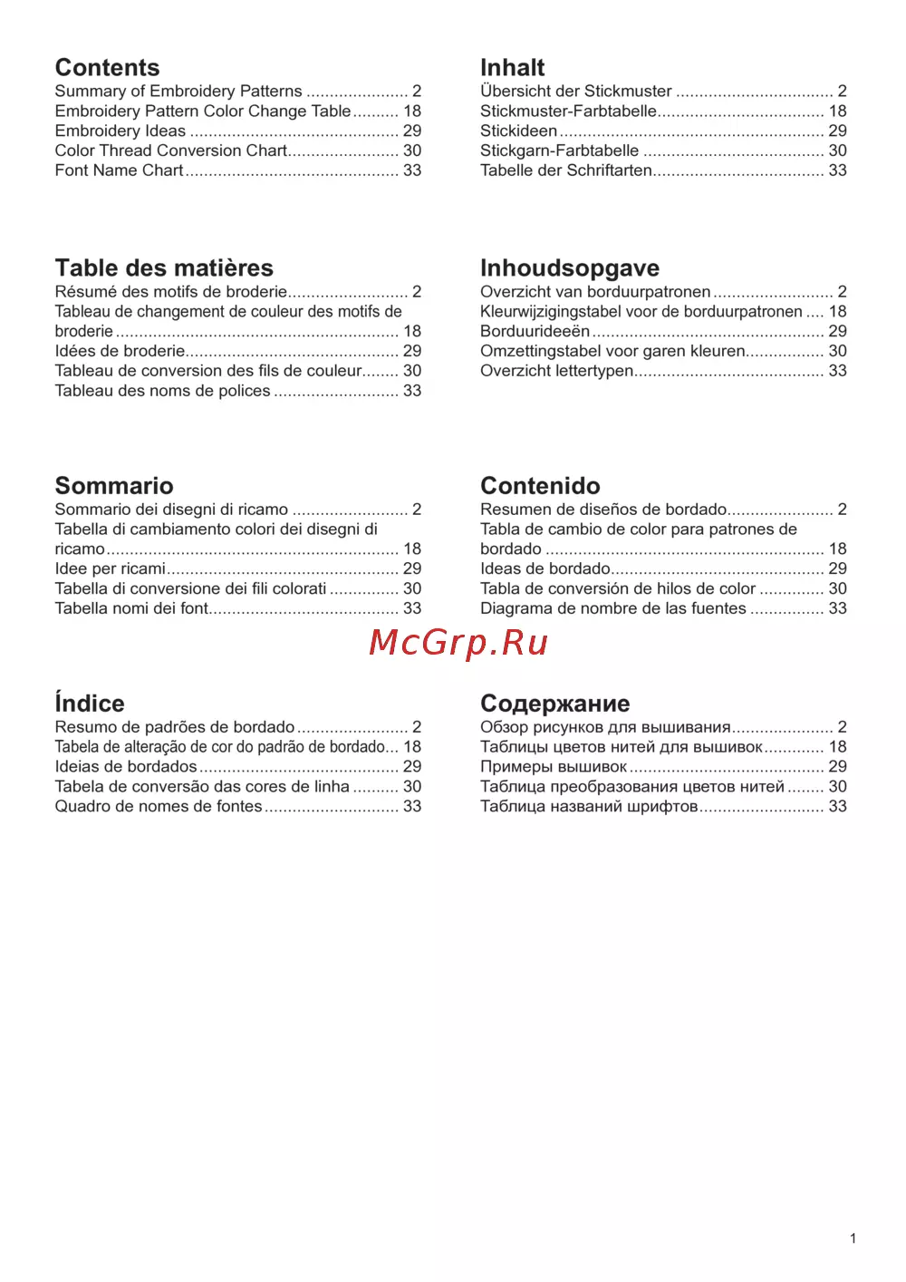 - Summary of embroidery patterns übersicht der stickmuster résumé des motifs de broderie overzicht van borduurpatronen sommario dei disegni di ricamo resumen de diseños de bordado resumo de padrões de bordado обзор рисунков для вышивания p.11