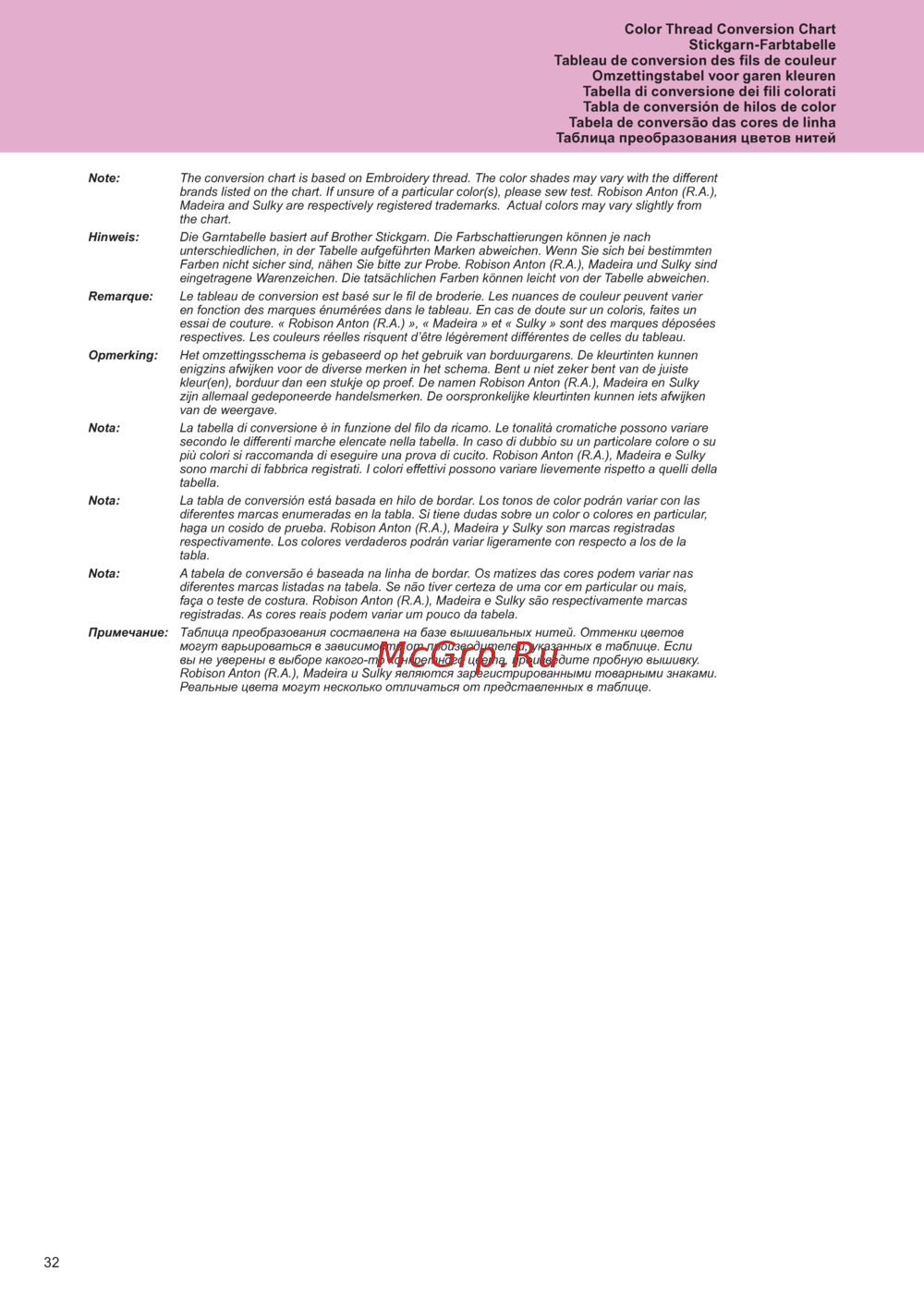 - Color thread conversion chart stickgarn farbtabelle tableau de conversion des fils de couleur omzettingstabel voor garen kleuren tabella di conversione dei fili colorati tabla de conversión de hilos de color tabela de conversão das cores de linha таблица преобразования цветов нитей p.34