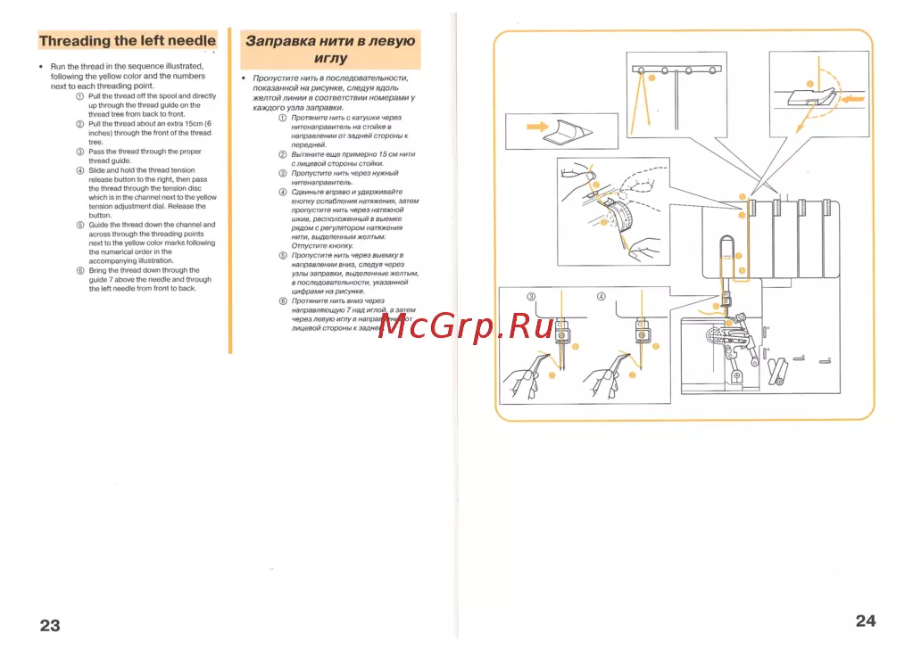 Threading the left needle Run the thread in the sequence illustrated following the yellow color and the numbers next to each threading point Pull the thread off the spool and directly up through the thread guide on the thread tree from back to front Pull the thread about an extra 15cm 6 inches through the front of the thread tree Pass the thread through the proper thread guide Slide and hold the thread tension release button to the right then pass the thread through the tension disc which is in the channel next to the yellow tension adjustment dial Release the button Guide the thread down the channel and across through the threading points next to the yellow color marks following the numerical order in the accompanying illustration Bring the thread down through the guide 7 above the needle and through the left needle from front to back Заправка нити в левую иглу Пропустите нить в последовательности показанной на рисунке следуя вдоль желтой линии в соответствии номерами у каждого узла заправки ф Протяните нить с катушки через нитенаправитель на стойке в направлении от задней стороны к передней Вытяните еще примерно 15 см нити с лицевой стороны стойки Пропустите нить через нужный нитенаправитель Сдвиньте вправо и удерживайте кнопку ослабления натяжения затем пропустите нить через натяжной шкив расположенный в выемке рядом с регулятором натяжения нити выделенным желтым Отпустите кнопку Пропустите нить через выемку в направлении вниз следуя через узлы заправки выделенные желтым в последовательности указанной цифрами на рисунке Протяните нить вниз через направляющую 7 над иглой а затем через левую иглу в направлении от лицевой стороны к задней 23 24