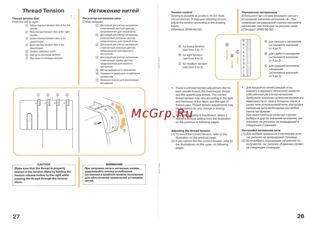 Thread Tension Натяжение нитей Thread tension dial Регулятор натяжения нити From the left to right Yellow marked tension disc is for left needle Pink marked tension disc is for right needle Green marked tension disc is for upperlooper 4 Blue marked tension disc is for lowerlooper Tension selection mark Dial upto decrease tension Dial down to increase tension Слева направо Дисковый регулятор натяжения отмеченный желтым цветом предназначен для левой иглы Tension control Управление натяжением Sewing is possible at position 4 for most circumstances If improper stitching occurs adjust the tension according to the drawing below Standard SPAN 60 3Z В большинстве случаев возможно шитье с установкой значения натяжения 4 При появлении неправильной строчки настройте натяжение как показано на рисунке ниже Стандарт SPAN 60 3Z Дисковый регулятор натяжения отмеченный розовым цветом предназначен для правой иглы Дисковый регулятор натяжения отмеченный зеленым цветом предназначен для верхнего петлителя Дисковый регулятор натяжения отмеченный синим цветом предназначен для нижнего петлителя Метка выбранного натяжения для сильного натяжения установите значение for heavy tension set from 4 to 7 от 4 до 7 для слабого натяжения for light tension set from 4 to 2 установите значение от 4 до 2 for medium tension set from 5 to 3 для средней величины натяжения установите значение Поверните вверх для ослабления натяжения от 5 до 3 Поверните вниз для увеличения натяжения There is a thread tension adjustment dial for each needle thread the lowerlooper thread and the upperlooper thread The correct thread tension may vary according to the type and thickness of the fabric and the type of thread used Thread tension adjustments may be necessary for any change in sewing materials If the stitch quality is insufficient select a different tension setting from the illustration on the previous or following pages а Для каждой из нитей каждой иглы нижнего и верхнего петлителя имеется собственный регулятор натяжения Требуемое значение натяжения меняется в зависимости от типа и толщины ткани а также типа используемой нити Настройка натяжения нити необходима при любой смене материала При недостаточном качестве строчки выберите другое значение натяжения как показано на рисунках на предыдущей и следующих страницах CAUTION Make sure that the thread is properly seated in the tension discs by holding the tension release button to the right while passing the thread through the tension discs 27 Adjusting the thread tension Настройка натяжения нити 1 To select the correct tension refer to the illustration on the previous page 2 If you cannot find the correct tension refer to the illustrations In this case on following pages 1 Для выбора правильного натяжения нити см рисунок на предыдущей странице 2 Если выбрать подходящее натяжение не получается см рисунок В данном случае на следующих страницах ВНИМАНИЕ При заправке нити в натяжные шкивы удерживайте кнопку ослабления натяжения в крайнем правом положении для обеспечения правильной установки нитей 28