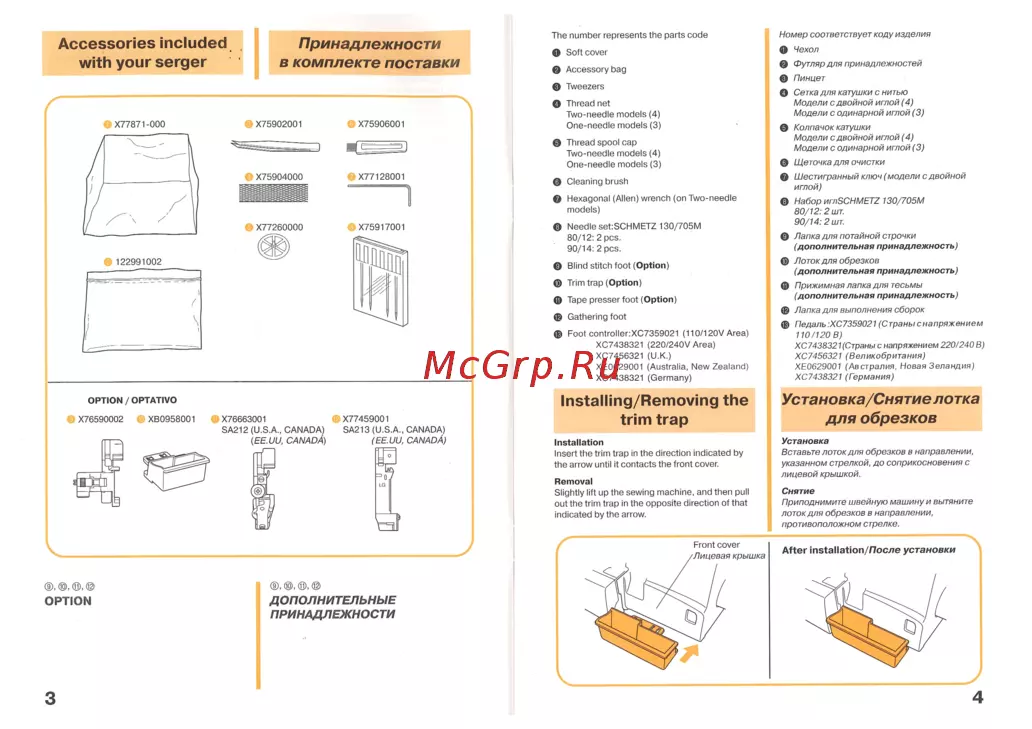 Accessories included with your serger Принадлежности в комплекте поставки The number represents the parts code Номер соответствует коду изделия Soft cover Чехол Accessory bag Футляр для принадлежностей Пинцет Tweezers Thread net Two needle models 4 One needle models 3 Thread spool cap Two needle models 4 One needle models 3 Cleaning brush Hexagonal Allen wrench on Two needle models Needle set SCHMETZ 130 705M 80 12 2 pcs 90 14 2 pcs Blind stitch foot Option Trim trap Option Tape presser foot Option Gathering foot Foot controller XC7359021 110 120V Area XC7438321 220 240V Area XC7456321 U K XE0629001 Australia New Zealand XC7438321 Germany OPTION OPTATIVO X76590002 XB0958001 X76663001 SA212 U S A CANADA X77459001 SA213 U S A CANADA EE UU CANADÁ EEUU CANADÁ Installing Removing the trim trap Сетка для катушки с нитью Модели с двойной иглой 4 Модели с одинарной иглой 3 Колпачок катушки Модели с двойной иглой 4 Модели с одинарной иглой 3 Щеточка для очистки Шестигранный ключ модели с двойной иглой Набор иглЗСНМЕТХ 130 705М 80 12 2 шт 90 14 2 шт 0 Лапка для потайной строчки дополнительная принадлежность Лоток для обрезков дополнительная принадлежность Прижимная лапка для тесьмы дополнительная принадлежность Лапка для выполнения сборок Педаль ХС7359021 Страны с напряжением 110 120 В ХС7438321 Страны с напряжением 220 240 В ХС7456321 Великобритания ХЕ0629001 Австралия Новая Зеландия ХС7438321 Германия Установка Снятие лотка для обрезков Installation Установка Insert the trim trap in the direction indicated by the arrow until it contacts the front cover указанном стрелкой до соприкосновения с Removal Slightly lift up the sewing machine and then pull out the trim trap in the opposite direction of that indicated by the arrow Вставьте лоток для обрезков в направлении лицевой крышкой Снятие Приподнимите швейную машину и вытяните лоток для обрезков в направлении противоположном стрелке After installation 7oczze установки OPTION 3 ДОПОЛНИТЕЛЬНЫЕ ПРИНАДЛЕЖНОСТИ