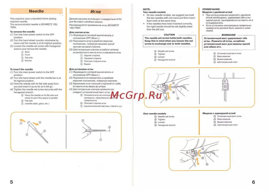 Needle Игла This machine uses a standard home sewing machine needle The recommended needle is SCHMETZ 130 705H Данная машина использует стандартные иглы To remove the needle Для снятия иглы 1 Turn the main power switch to the OFF position 2 Turn the hand wheel counter clockwise by hand until the needle is at its highest position 3 Loosen the needle set screw with hexagonal wrench and remove the needle Back Front Flat side Groove 1 Переведите сетевой выключатель в для бытовых швейных машин Рекомендуется применение иглы SCHMETZ 130 705Н положение ОРР Выкл 2 Поднимите иглу в крайнее верхнее положение повернув маховик рукой NOTE Two needle models On two needle models we suggest you hold the two needles with one hand and then insert them both at the same time If the needles have been inserted correctly the right needle should be set slightly lower than the left one CAUTION The needle set screw holds both needles Keep this in mind when you loosen the set screw to exchange one or both needles против часовой стрелки 3 Шестигранным ключом ослабьте затяжку установочного винта иглы и извлеките иглу ф Задняя сторона Лицевая сторона Плоская сторона иглы ПРИМЕЧАНИЕ Модели с двойной иглой 0 При использовании моделей с двойной иглой необходимо удерживая обе иглы одной рукой одновременно вставить их в иглодержатель Если установка произведена правильно правая игла должна быть немного ниже левой ВНИМАНИЕ Установочный винт удерживает обе иглы Помните об этом ослабляя установочный винт для замены одной или обеих игл Needle set screw Tighten Loosen Hexagonal wrench Установочный винт иглы Ввинчивание Вывинчивание Шестигранный ключ Вырез To insert the needle Для установки иглы 1 Turn the main power switch to the OFF position 2 Turn the hand wheel until the needle bar is at its highest position 3 Hold the needle with its flat side away from you and insert it up as far as it will go 4 Tighten the needle set screw securely with the hexagonal wrench Place the needle on its flat side and check to see if the space is parallel Flat side needle plate glass etc 1 Переведите сетевой выключатель в положение ОРР Выкл 2 Поднимите игловодитель в крайнее верхнее положение повернув маховик 3 Удерживая иглу плоской стороной от себя вставьте иглу вверх до упора 4 Шестигранным ключом затяните как следует установочный винт иглы Положите иглу на плоскую сторону и проверьте параллельна ли игла поверхности Плоская сторона иглы крышка игольной пластины стекло и т д One needle models Needle set screw Tighten Loosen Hexagonal wrench 5 Модели с одинарной иглой Установочный винт иглы Ввинчивание Вывинчивание Шестигранный ключ 6