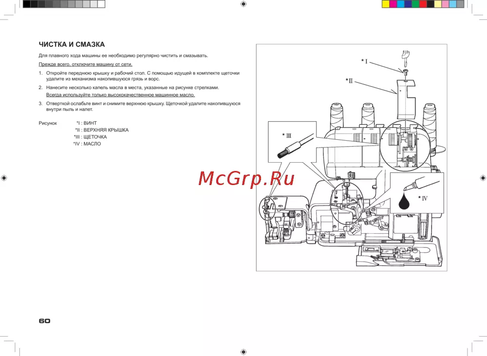 Для плавного хода машины ее необходимо регулярно чистить и смазывать.