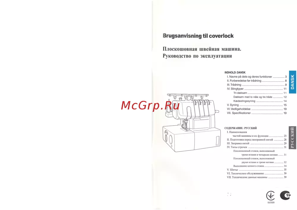 Srugsanvisning til coverlock Плоскошовная швейная машина Руководство по эксплуатации INDHOLD DANSK I Navne pá dele og deres funktioner 3 II Forberedelse fertrádnlng 8 III Trádning 9H IV Stingtyper 11 Tri deeksom 11 Deeksom med to nále og tre tráde 12 Keedestingssyning 14 V Syning 15 VLVedligeholdelse 19 Vil Specifikationer 19 СОДЕРЖАНИЕ РУССКИЙ T Наименования частей машины и их функции 23 II Подготовка перед заноравкой нитей 28 III Заправка нитей 29 IV Типы строчек 31 Плоскошовный стежок выполняемый тремя иглами и четырьмя нитями 31 Плоскошовный стежок выполняемый двумя иглами и тремя нитями 32 Выполнение цепного стежка 34 V Шитье 35 VI Техническое обслуживание 39 VII Технические данные машины 39 IUA TR 004l