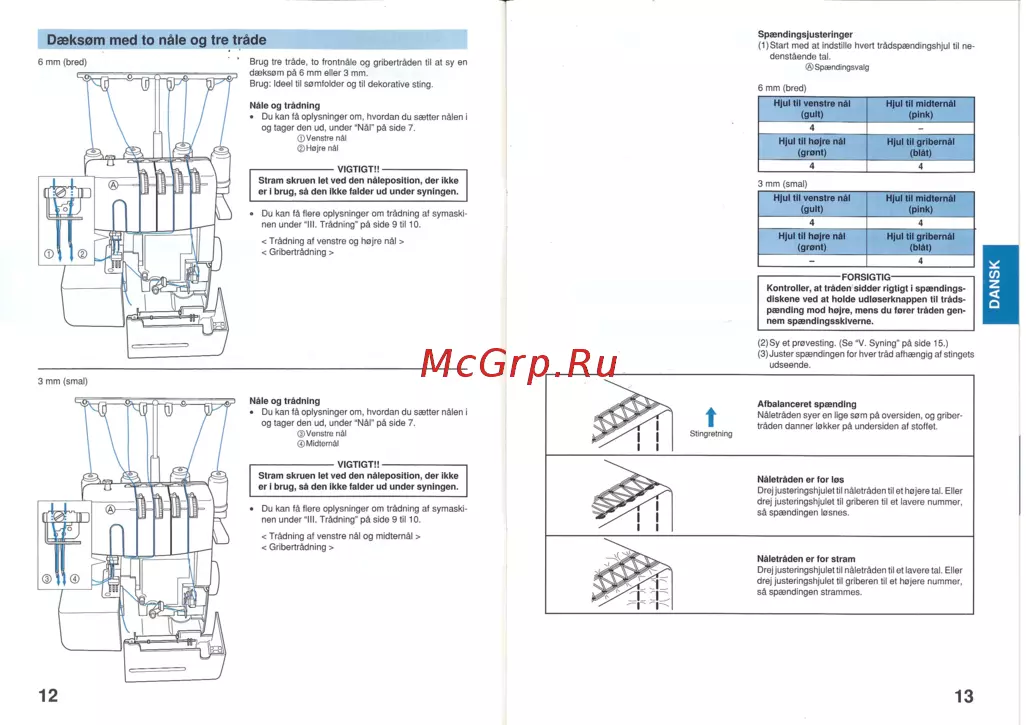 Spaendingsjusteringer Daeksom med to näle og tre trade Brug tre trade to frontnäle og griberträden til at sy en deeksom pä 6 mm eller 3 mm Brug Ideel til somfolder og til dekorative sting Speendingsvalg 6 mm bred Hjul til venstre näl guit Näle og trädning Du kan fä oplysninger om hvordan du seetter nälen i og tager den ud under Näl pä side 7 Venstre näl Hojre näl VIGTIGT Stram skruen let ved den näleposition der ikke er I brug sä den ikke falder ud under syningen 4 Hjul til midternäl pink Hjul til hajre näl grant Hjul til gribernäl blät 4 4 Hjul til venstre näl guit Hjul til midternäl Pink 4 4 Hjul til hajre näl grant Hjul til gribernäl blät 4 3 mm smal o Du kan fä fiere oplysninger om trädning af symaskinen under III Trädning pä side 9 til 10 Trädning af venstre og hajre näl Griberträdning FORSIGTIG Kontroller at träden sidder rigtigt i spaendingsdiskene ved at holde udlaserknappen til trädspaending mod hajre mens du farer träden gennem spaendingsskiverne 2 Sy et provesting Se V Syning pä side 15 3 Juster speendingen for hver träd afhaangig af stingets udseende 3 mm smal Näle og trädning t Du kan fä oplysninger om hvordan du satter nälen i og tager den ud under Näl pä side 7 Venstre näl Midternäl I 11 VIGTIGT Stram skruen let ved den näleposition der ikke er i brug sä den ikke falder ud under syningen Du kan fä fiere oplysninger om trädning af symaskinen under III Trädning pä side 9 til 10 Stingretning Afbalanceret speending Näleträden syer en lige som pä oversiden og griberträden danner lakker pä undersiden af stoffet Näleträden er for las 11 Drej justeringshjulet til näleträden til et hojere tal Eller drej justeringshjulet til griberen til et lavere nummer sä spaendingen losnes i juüvv A A y Trädning af venstre näl og midtemäl Griberträdning 12 Näleträden er for stram Drej justeringshjulettil näleträden til et lavere tal Eller drej justeringshjulet til griberen til et hojere nummer sä spaendingen strammes 13 DANSK 6 mm bred 1 Start med at indstille hvert trädspaendingshjul til nedenstäende tal