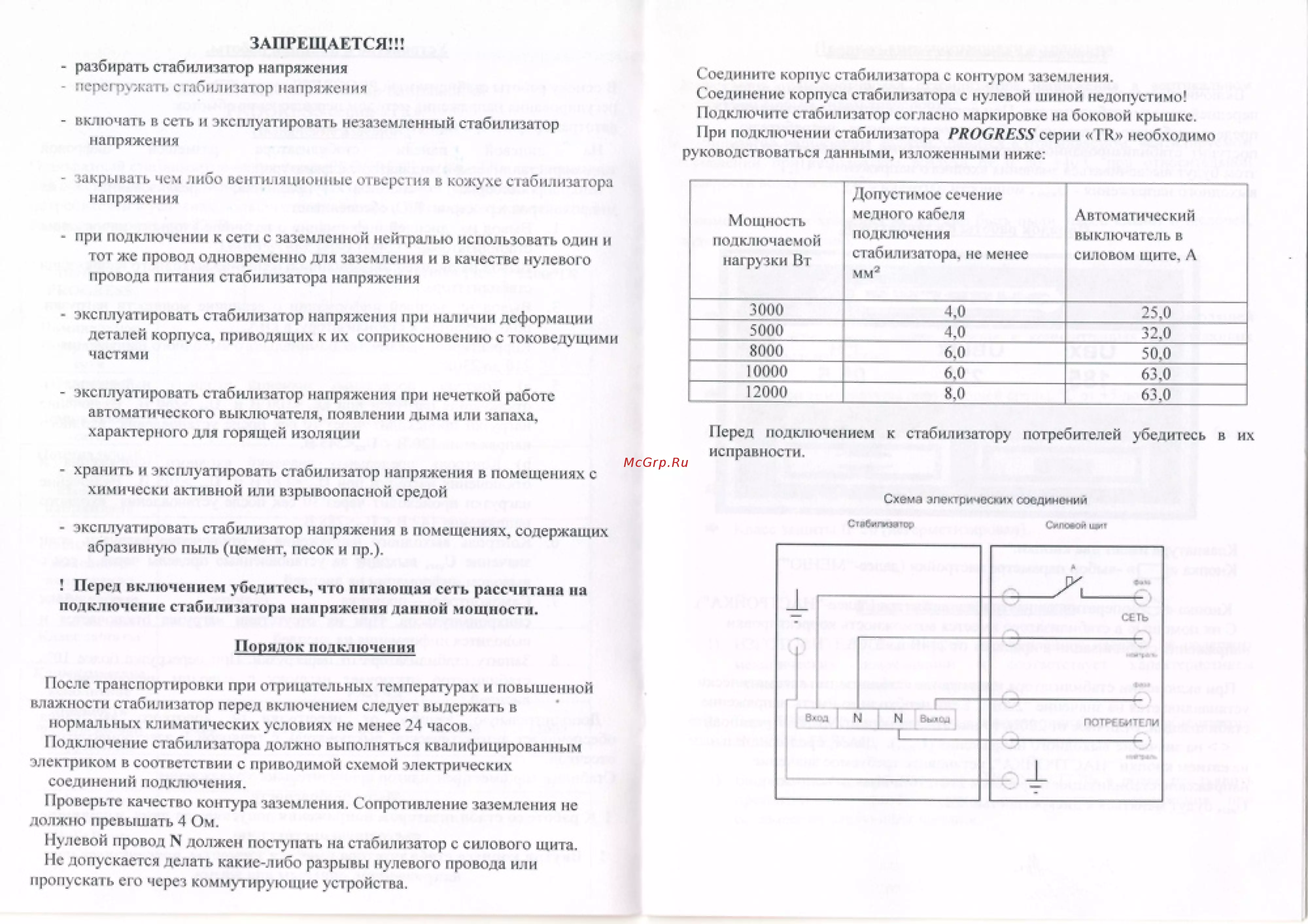 ЗАПРЕЩАЕТСЯ разбирать стабилизатор напряжения перегружать стабилизатор напряжения включать в сеть и эксплуатировать незаземленный стабилизатор напряжения Соедините корпус стабилизатора с контуром заземления Соединение корпуса стабилизатора с нулевой шиной недопустимо Подключите стабилизатор согласно маркировке на боковой крышке 11ри подключении стабилизатора PROGRESS серии TR необходимо руководствоваться данными изложенными ниже закрывать чем либо вентиляционные отверстия в кожухе стабилизатора напряжения при подключении к сети с заземленной нейтралью использовать один и тот же провод одновременно для заземления и в качестве нулевого провода питания стабилизатора напряжения эксплуатировать стабилизатор напряжения при наличии деформации деталей корпуса приводящих к их соприкосновению с токоведущими частями эксплуатировать стабилизатор напряжения при нечеткой работе автоматического выключателя появлении дыма или запаха характерного для горящей изоляции хранить и эксплуатировать стабилизатор напряжения в помещениях с химически активной или взрывоопасной средой эксплуатировать стабилизатор напряжения в помещениях содержащих абразивную пыль цемент песок и пр Перед включением убедитесь что питающая сеть рассчитана на подключение стабилизатора напряжения данной мощности Порядок подключения После транспортировки при отрицательных температурах и повышенной влажности стабилизатор перед включением следует выдержать в нормальных климатических условиях нс менее 24 часов Подключение стабилизатора должно выполняться квалифицированным электриком в соответствии с приводимой схемой электрических соединений подключения Проверьте качество контура заземления Сопротивление заземления не должно превышать 4 Ом Пулевой провод N должен поступать на стабилизатор с силового щита Нс допускается делать какие либо разрывы нулевого провода или пропускать его через коммутирующие устройства Мощность подключаемой нагрузки Вт 3000 5000 8000 10000 12000 Допустимое сечение медного кабеля подключения стабилизатора не менее мм Автоматический выключатель в силовом щите А 4 0 4 0 6 0 6 0 8 0 25 0 32 0 50 0 63 0_________ 63 0 Перед подключением к стабилизатору потребителей убедитесь в их исправности Схема электрических соединений