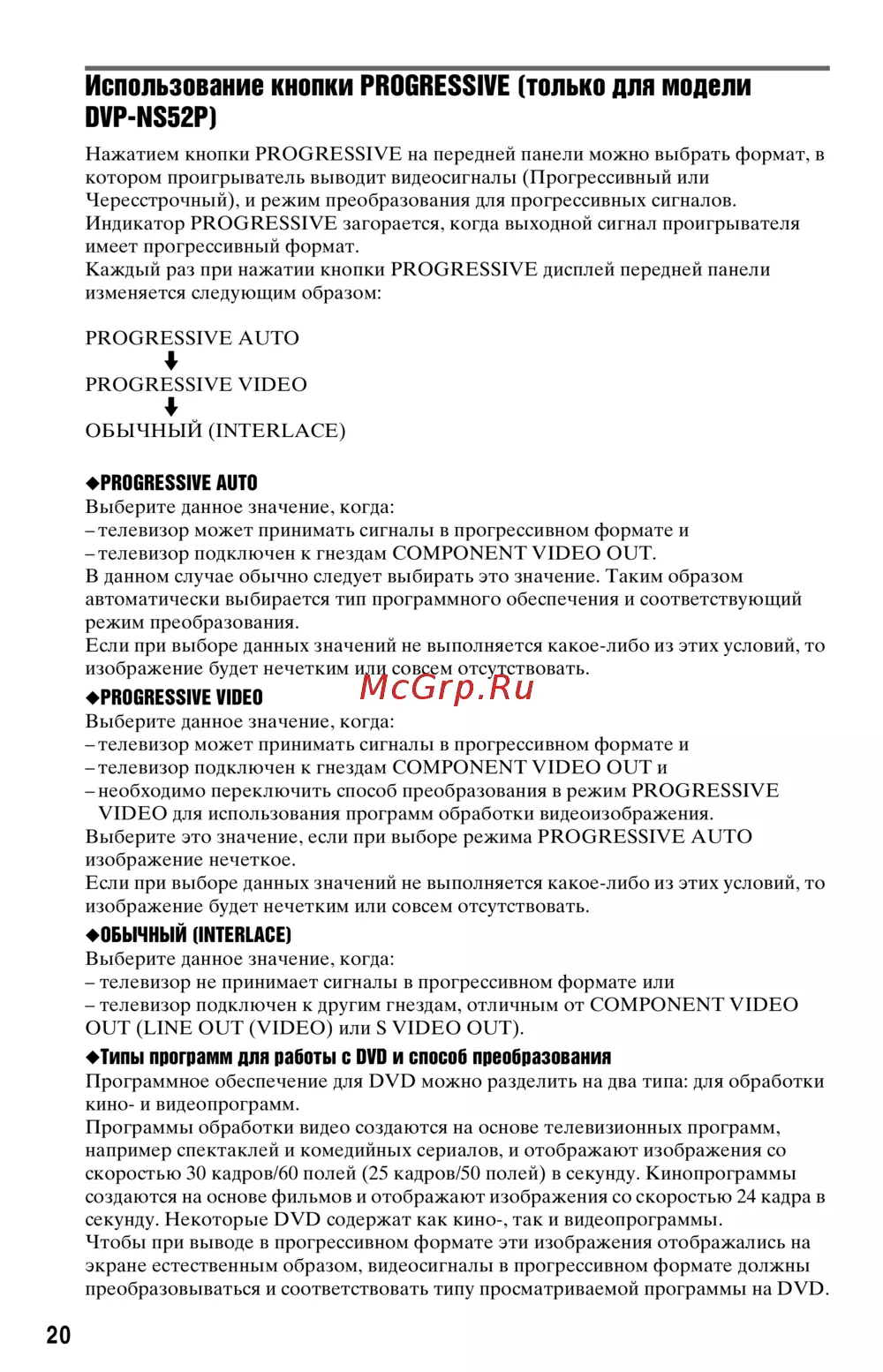 Sony DVP-NS32 — как использовать кнопку PROGRESSIVE для видеопроигрывателей [20/94]