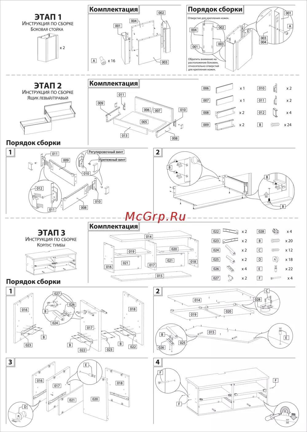 Порядок сборки ЭТАП 1 Отверстие для крепления ножек ИНСТРУКЦИЯ ПО СБОРКЕ БОКОВАЯ СТОЙКА 004 003 004 ГРОЗ Обратить внимание на расположение боковин относительно отверстий для крепления ножек Порядок сборки Комплектация ЭТАПЗ ИНСТРУКЦИЯ ПО СБОРКЕ II IП I лх2 023 1 х2 КОРПУС ТУМБЫ Порядок сборки 024 х2 025 х2 026 х4 027 х2 1 028 1 1Й Жх4 1 Ж х 20 И Е ж 12 Е й Е 1 х22 х х 18 х4