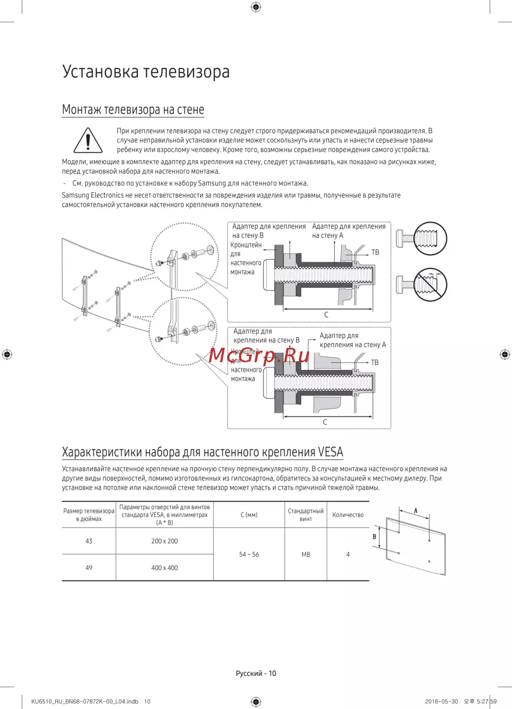Samsung UE43KU6510U — правила установки телевизора на стену для безопасного монтажа [10/60]