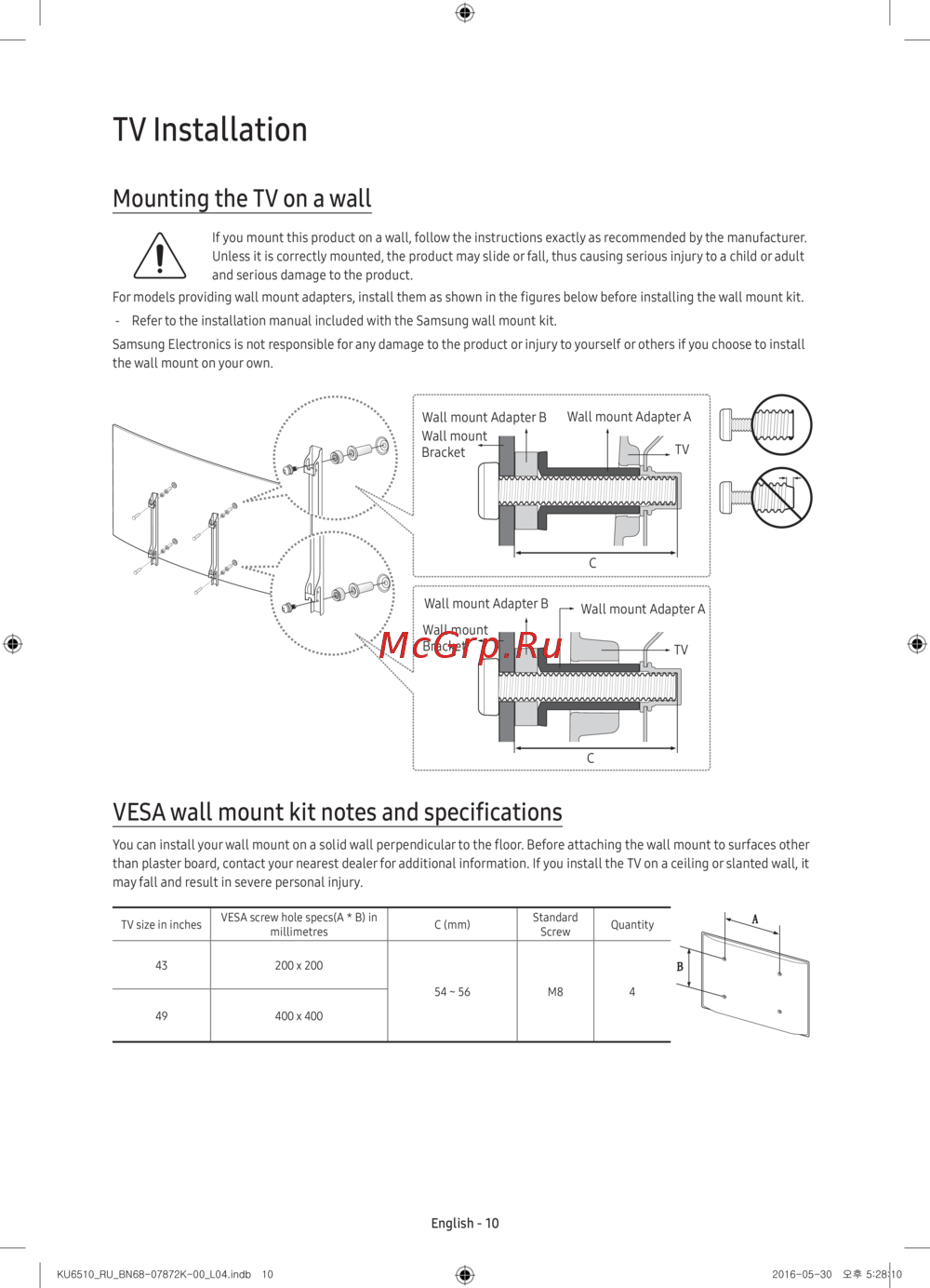 Samsung UE43KU6510U — установка телевизора на стену: безопасные рекомендации [26/60]