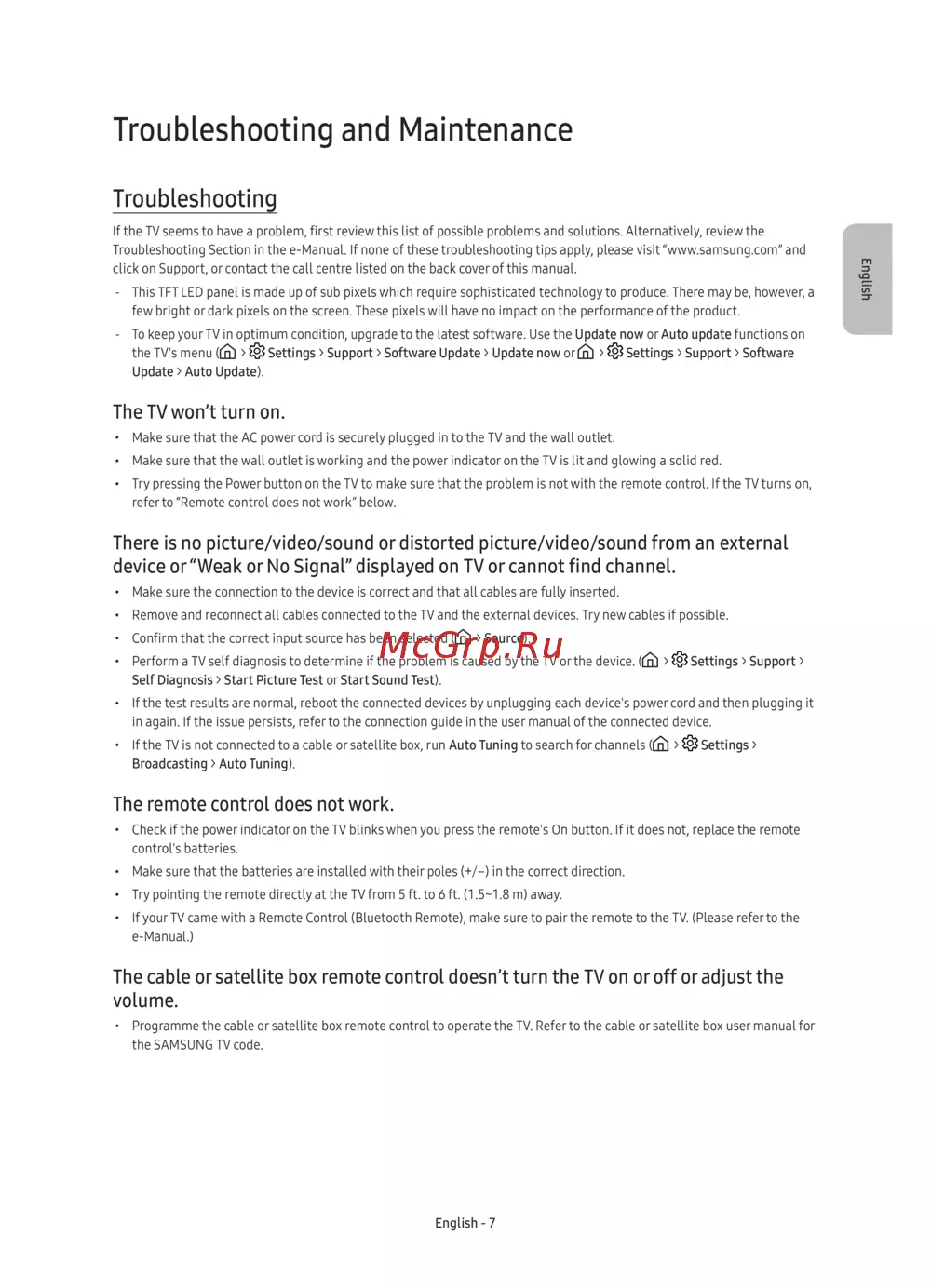 - Невозможно включить или выключить телевизор или отрегулировать громкость с помощью пульта дистанционного управления тюнером кабельного тв или тв приставкой p.7