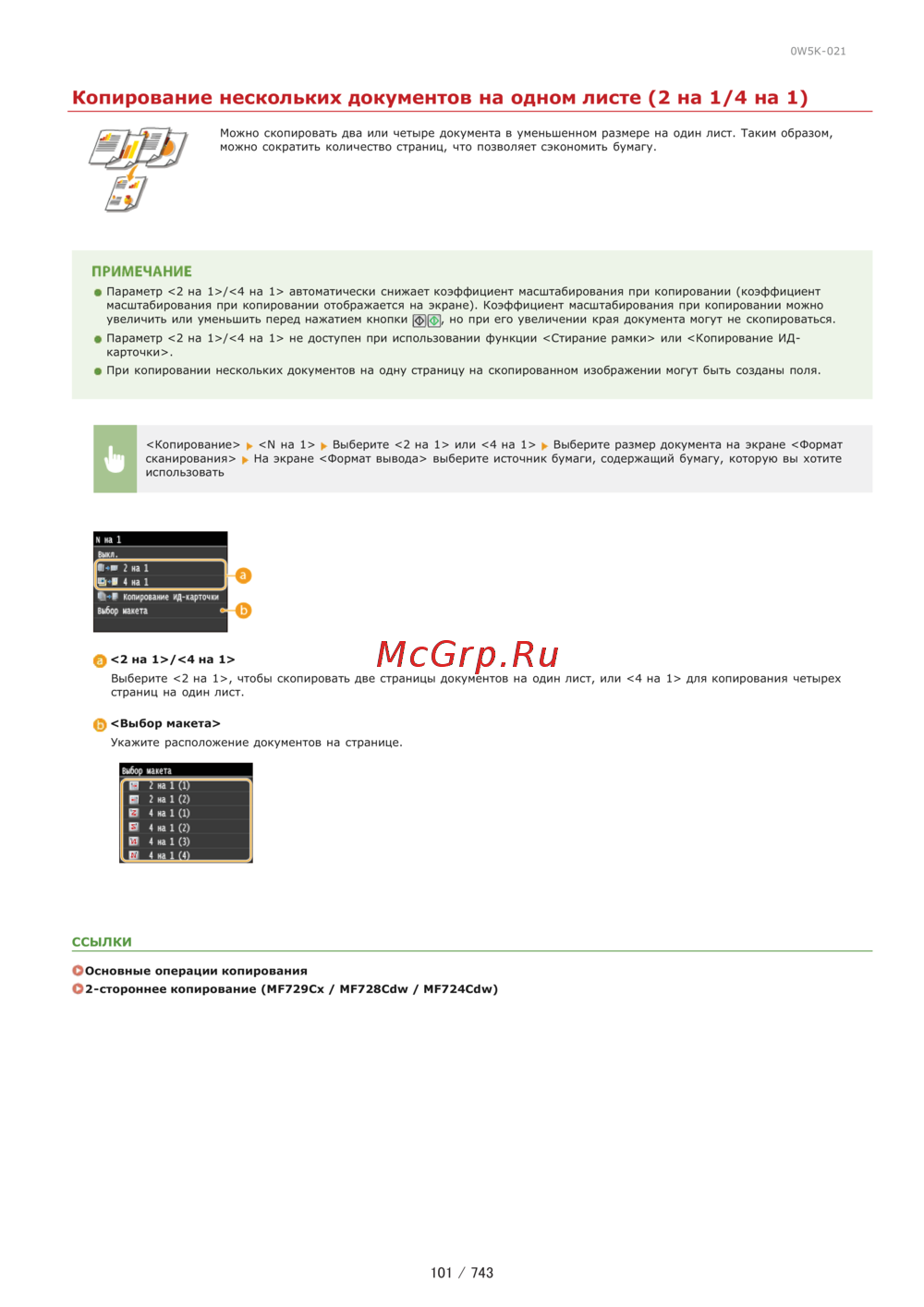0W5K 021 Копирование нескольких документов на одном листе 2 на 1 4 на 1 Можно скопировать два или четыре документа в уменьшенном размере на один лист Таким образом можно сократить количество страниц что позволяет сэкономить бумагу ПРИМЕЧАНИЕ Параметр 2 на 1 4 на 1 автоматически снижает коэффициент масштабирования при копировании коэффициент масштабирования при копировании отображается на экране Коэффициент масштабирования при копировании можно увеличить или уменьшить перед нажатием кнопки ф ф но при его увеличении края документа могут не скопироваться Параметр 2 на 1 4 на 1 не доступен при использовании функции Стирание рамки или копирование ИДкарточки При копировании нескольких документов на одну страницу на скопированном изображении могут быть созданы поля Копирование М на 1 Выберите 2 на 1 или 4 на 1 Выберите размер документа на экране Формат сканирования к На экране Формат вывода выберите источник бумаги содержащий бумагу которую вы хотите использовать 0 2 на 1 4 на 1 Выберите 2 на 1 чтобы скопировать две страницы документов на один лист или 4 на 1 для копирования четырех страниц на один лист 0 Выбор макета Укажите расположение документов на странице вмбор макета И 2 на 1 1 г 2 на 1 0 4 на 1 1 В 4 на 1 2 И 4 на 1 3 О 4 на 1 4 ССЫЛКИ ООсновные операции копирования О2 стороннее копирование МР729Сх МР728Сди MF724Cdw 101 743