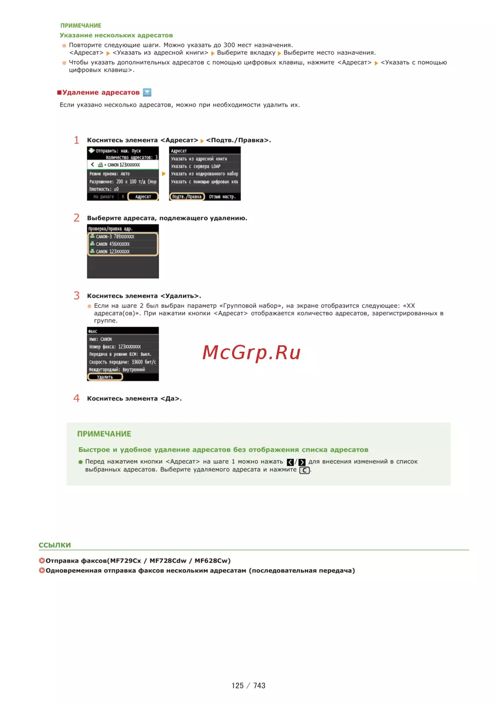 Canon i-SENSYS MF728Cdw Лазерный \ светодиодный, Серый, Цветная, А4 — как указать и удалить адресатов для отправки факсов [125/790]