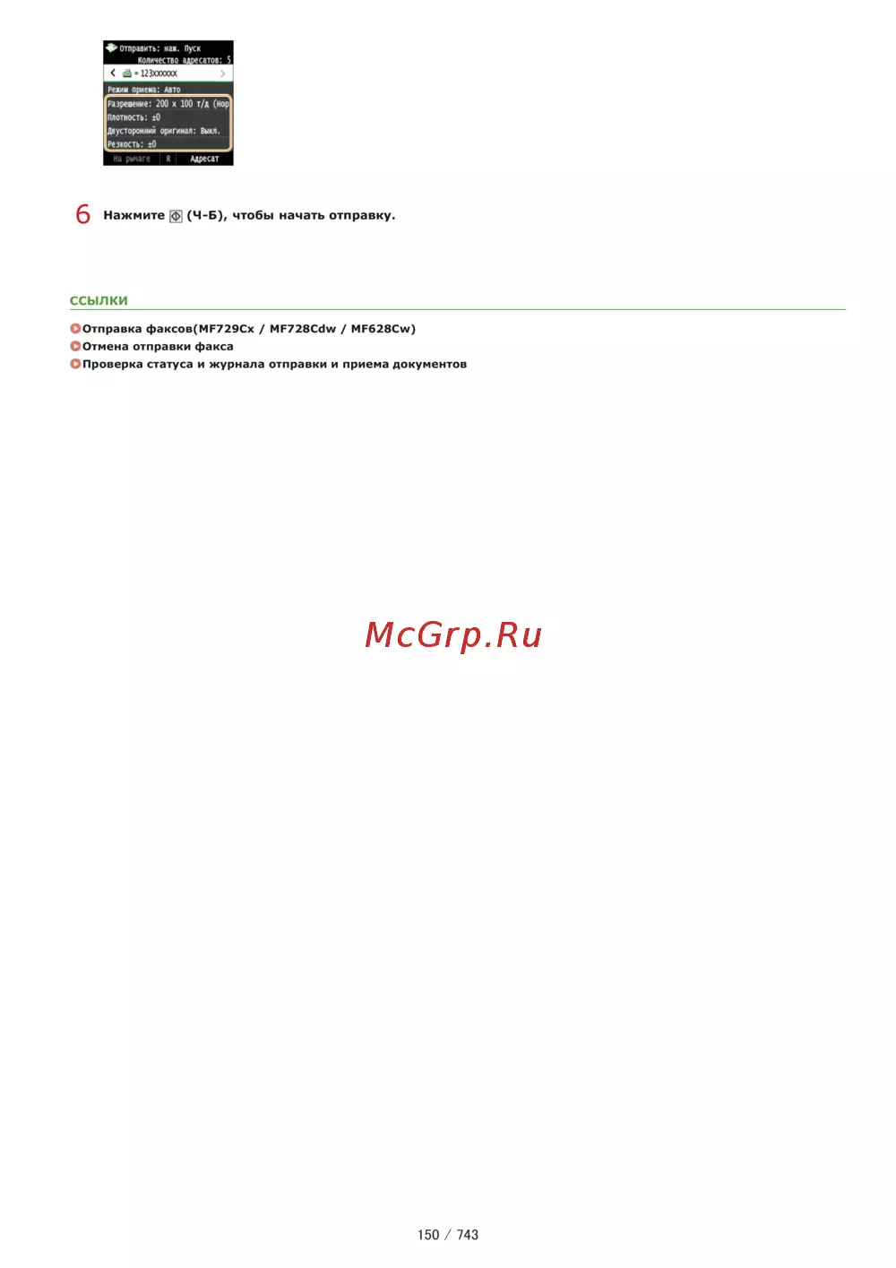 Отправить наж пуск __________ количество адресатов 5 I ИйХШ Ремии приема АВТО Разрешение 200 х 100 т д Нор плотность 0 двусторонний оригинал выкл Резкость 0 на рьнаге R Адресат 6 Нажмите ф Ч Б чтобы начать отправку ССЫЛКИ О Отправка факсов МР729Сх МР728Сди MF628Cw ООтмена отправки факса ОПроверка статуса и журнала отправки и приема документов 150 743