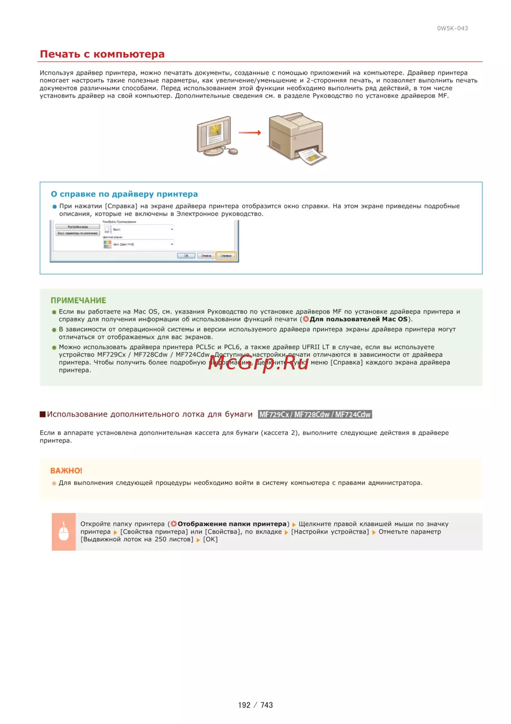 0W5K 043 Печать с компьютера Используя драйвер принтера можно печатать документы созданные с помощью приложений на компьютере Драйвер принтера помогает настроить такие полезные параметры как увеличение уменьшение и 2 сторонняя печать и позволяет выполнить печать документов различными способами Перед использованием этой функции необходимо выполнить ряд действий в том числе установить драйвер на свой компьютер Дополнительные сведения см в разделе Руководство по установке драйверов МР О справке по драйверу принтера При нажатии Справка на экране драйвера принтера отобразится окно справки На этом экране приведены подробные описания которые не включены в Электронное руководство L Ато ПРИМЕЧАНИЕ Если вы работаете на Mac OS см указания Руководство по установке драйверов MF по установке драйвера принтера и справку для получения информации об использовании функций печати Для пользователей MacOS В зависимости от операционной системы и версии используемого драйвера принтера экраны драйвера принтера могут отличаться от отображаемых для вас экранов Можно использовать драйвера принтера PCL5c и PCL6 а также драйвер UFRII LT в случае если вы используете устройство MF729Cx MF728Cdw MF724Cdw Доступные настройки печати отличаются в зависимости от драйвера принтера Чтобы получить более подробную информацию щелкните пункт меню Справка каждого экрана драйвера принтера Использование дополнительного лотка для бумаги MF729CX MF728Cdw MF724CdW Если в аппарате установлена дополнительная кассета для бумаги кассета 2 выполните следующие действия в драйвере принтера ВАЖНО Для выполнения следующей процедуры необходимо войти в систему компьютера с правами администратора 0 Откройте папку принтера Отображение папки принтера Щелкните правой клавишей мыши по значку принтера Свойства принтера или Свойства по вкладке Настройки устройства к Отметьте параметр Выдвижной лоток на 250 листов ОК 192 743