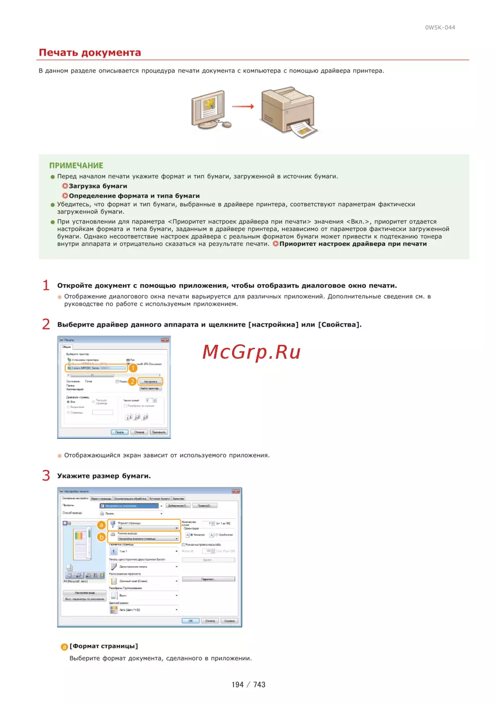 0W5K 044 Печать документа В данном разделе описывается процедура печати документа с компьютера с помощью драйвера принтера ПРИМЕЧАНИЕ Перед началом печати укажите формат и тип бумаги загруженной в источник бумаги Загрузка бумаги ООпределение формата и типа бумаги Убедитесь что формат и тип бумаги выбранные в драйвере принтера соответствуют параметрам фактически загруженной бумаги При установлении для параметра Приоритет настроек драйвера при печати значения Вкл приоритет отдается настройкам формата и типа бумаги заданным в драйвере принтера независимо от параметров фактически загруженной бумаги Однако несоответствие настроек драйвера с реальным форматом бумаги может привести к подтеканию тонера внутри аппарата и отрицательно сказаться на результате печати Приоритет настроек драйвера при печати Откройте документ с помощью приложения чтобы отобразить диалоговое окно печати Отображение диалогового окна печати варьируется для различных приложений Дополнительные сведения см в руководстве по работе с используемым приложением Выберите драйвер данного аппарата и щелкните настройкиа или Свойства Отображающийся экран зависит от используемого приложения 3 Укажите размер бумаги Формат страницы Выберите формат документа сделанного в приложении 194 743