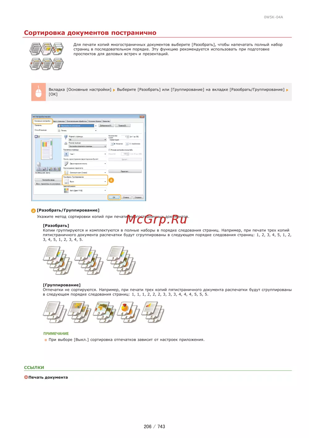 0W5K 04A Сортировка документов постранично Для печати копий многостраничных документов выберите Разобрать чтобы напечатать полный набор страниц в последовательном порядке Эту функцию рекомендуется использовать при подготовке проспектов для деловых встреч и презентаций Н Вкладка Основные настройки Выберите Разобрать или Группирование на вкладке Разобрать Группирование ОК Разобрать Группирование Укажите метод сортировки копий при печати многостраничных документов Разобрать Копии группируются и комплектуются в полные наборы в порядке следования страниц Например при печати трех копий пятистраничного документа распечатки будут сгруппированы в следующем порядке следования страниц 1 2 3 4 5 1 2 3 4 5 1 2 3 4 5 Г руппирование Отпечатки не сортируются Например при печати трех копий пятистраничного документа распечатки будут сгруппированы в следующем порядке следования страниц 1 1 1 2 2 2 3 3 3 4 4 4 5 5 5 ПРИМЕЧАНИЕ При выборе Выкл сортировка отпечатков зависит от настроек приложения ССЫЛКИ О Печать документа 206 743