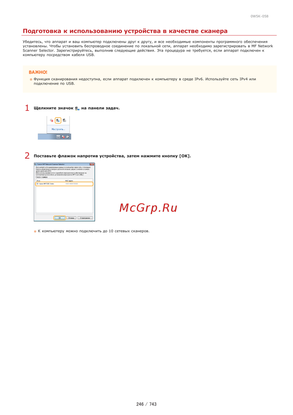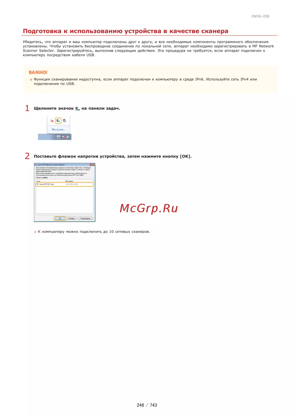 0W5K 058 Подготовка к использованию устройства в качестве сканера Убедитесь что аппарат и ваш компьютер подключены друг к другу и все необходимые компоненты программного обеспечения установлены Чтобы установить беспроводное соединение по локальной сети аппарат необходимо зарегистрировать в MF Network Scanner Selector Зарегистрируйтесь выполнив следующие действия Эта процедура не требуется если аппарат подключен к компьютеру посредством кабеля USB ВАЖНО Функция сканирования недоступна если аппарат подключен к компьютеру в среде IPv6 Используйте сеть IPv4 или подключение по USB Щелкните значок а на панели задач Настроить liras 2 Поставьте флажок напротив устройства затем нажмите кнопку ОК К компьютеру можно подключить до 10 сетевых сканеров 246 743