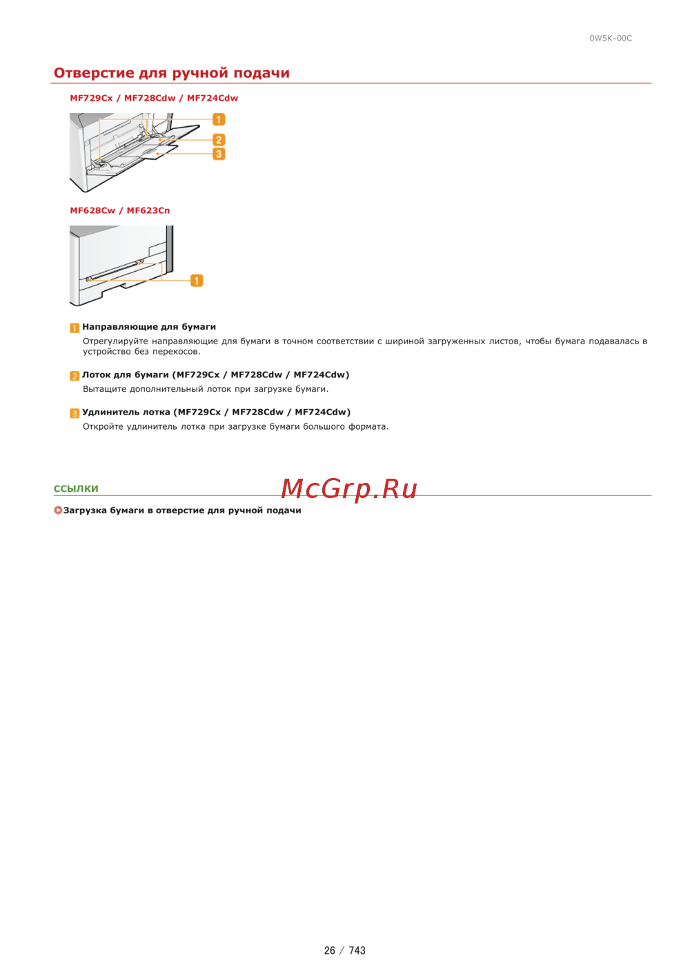 0W5K 00C Отверстие для ручной подачи МР729СХ MF728Cdw MF724Cdw MF628Cw МР623СП О Направляющие для бумаги Отрегулируйте направляющие для бумаги в точном соответствии с шириной загруженных листов чтобы бумага подавалась в устройство без перекосов Лоток для бумаги МР729СХ MF728Cdw MF724Cdw Вытащите дополнительный лоток при загрузке бумаги Удлинитель лотка МР729СХ MF728Cdw MF724Cdw Откройте удлинитель лотка при загрузке бумаги большого формата ССЫЛКИ ОЗагрузка бумаги в отверстие для ручной подачи 26 743