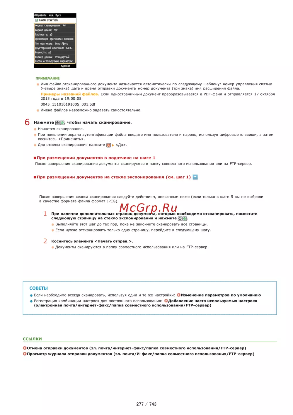 отправить нах Пуск Л САЧИ starfi sh мриат сканирования А4 Формат 0айла РОГ ПЛОТНОСТЬ 10 Ориентация оригинала книжная тмл оригинала текст фото двусторонний оригинал выкл Резкость 0 Размер данные Стандартный Часто исгаользуаые параметр ________________________ М ат ПРИМЕЧАНИЕ Имя файла отсканированного документа назначается автоматически по следующему шаблону номер управления связью четыре знака _дата и время отправки документа_номер документа три знака имя расширения файла Примеры названий файлов Если одностраничный документ преобразовывается в PDF файл и отправляется 17 октября 2015 года в 19 00 05 0045_151010191005_001 pdf Имена файлов невозможно задавать самостоятельно Нажмите ф чтобы начать сканирование Начнется сканирование При появлении экрана аутентификации файла введите имя пользователя и пароль используя цифровые клавиши а затем коснитесь Применить Для отмены сканирования нажмите Й Да При размещении документов в податчике на шаге 1 После завершения сканирования документы сканируются в папку совместного использования или на FTP сервер При размещении документов на стекле экспонирования см шаг 1 н После завершения сеанса сканирования следуйте действиям описанным ниже если только в шаге 5 вы не выбрали в качестве формата файла формат JPEG 1 При наличии дополнительных страниц документа которые необходимо отсканировать поместите следующую страницу на стекло экспонирования и нажмите ф ф Выполняйте этот шаг до тех пор пока не закончите сканировать все страницы Если нужно отсканировать только одну страницу перейдите к следующему шагу 2 Коснитесь элемента Начать отправ Документы сканируются в папку совместного использования или на FTP сервер СОВЕТЫ Если необходимо всегда сканировать используя одни и те же настройки О Изменение параметров по умолчанию Регистрация комбинации настроек для постоянного использования Добавление часто используемых настроек электронная почта интернет факс папка совместного использования РТР сервер ССЫЛКИ СОтмена отправки документов эл почта интернет факс папка совместного использования РТР сервер О Просмотр журнала отправки документов эл почта И факс папка совместного использования РТР сервер 277 743