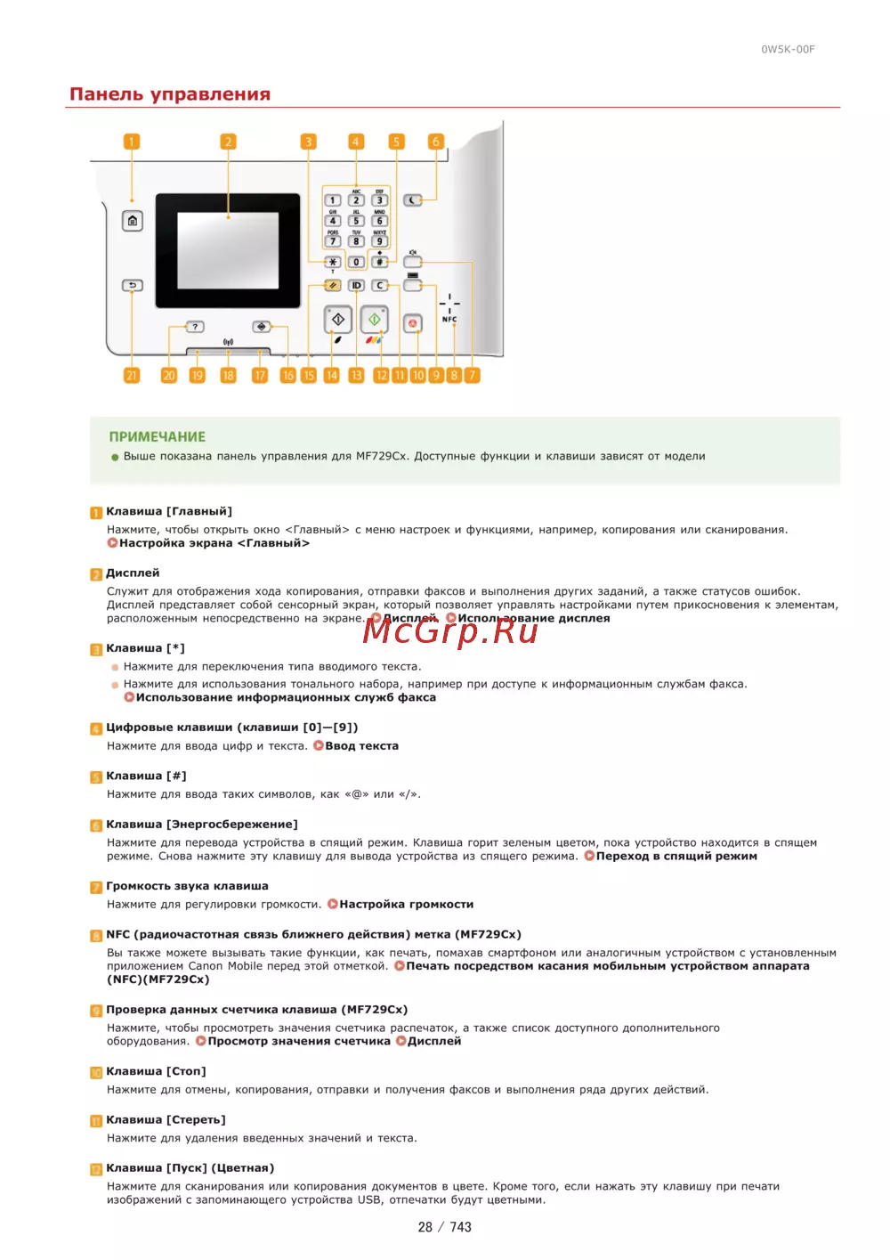 0W5K 00F Панель управления ПРИМЕЧАНИЕ Выше показана панель управления для МР729Сх Доступные функции и клавиши зависят от модели О Клавиша Главный Нажмите чтобы открыть окно Главный с меню настроек и функциями например копирования или сканирования ОНастройка экрана Главный Е Дисплей Служит для отображения хода копирования отправки факсов и выполнения других заданий а также статусов ошибок Дисплей представляет собой сенсорный экран который позволяет управлять настройками путем прикосновения к элементам расположенным непосредственно на экране Дисплей Использование дисплея Клавиша Нажмите для переключения типа вводимого текста Нажмите для использования тонального набора например при доступе к информационным службам факса ОИспользование информационных служб факса Цифровые клавиши клавиши О 9 Нажмите для ввода цифр и текста Ввод текста Клавиша Нажмите для ввода таких символов как или Клавиша Энергосбережение Нажмите для перевода устройства в спящий режим Клавиша горит зеленым цветом пока устройство находится в спящем режиме Снова нажмите эту клавишу для вывода устройства из спящего режима О Переход в спящий режим Громкость звука клавиша Нажмите для регулировки громкости ОНастройка громкости NFC радиочастотная связь ближнего действия метка MF729Cx Вы также можете вызывать такие функции как печать помахав смартфоном или аналогичным устройством с установленным приложением Canon Mobile перед этой отметкой Печать посредством касания мобильным устройством аппарата NFC MF729Cx Проверка данных счетчика клавиша MF729Cx Нажмите чтобы просмотреть значения счетчика распечаток а также список доступного дополнительного оборудования Просмотр значения счетчика Дисплей Клавиша Стоп Нажмите для отмены копирования отправки и получения факсов и выполнения ряда других действий Клавиша Стереть Нажмите для удаления введенных значений и текста Клавиша Пуск Цветная Нажмите для сканирования или копирования документов в цвете Кроме того если нажать эту клавишу при печати изображений с запоминающего устройства USB отпечатки будут цветными 28 743