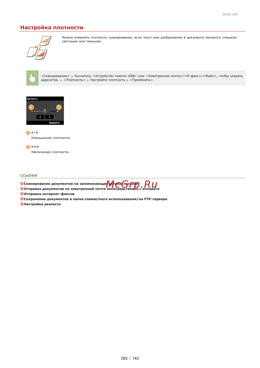 0W5K 05Y Настройка плотности Можно изменить плотность сканирования если текст или изображения в документе являются слишком светлыми или темными Сканирование Коснитесь Устройство памяти 05В или Электронная почта И факс Файл чтобы адресатов Плотность Настройте плотность Применить Уменьшение плотности Увеличение плотности ССЫЛКИ Сканирование документов на запоминающее устройство USB ООтправка документов по электронной почте непосредственно с аппарата Отправка интернет факсов Сохранение документов в папке совместного использования на FTP сервере О Настройка резкости 285 743