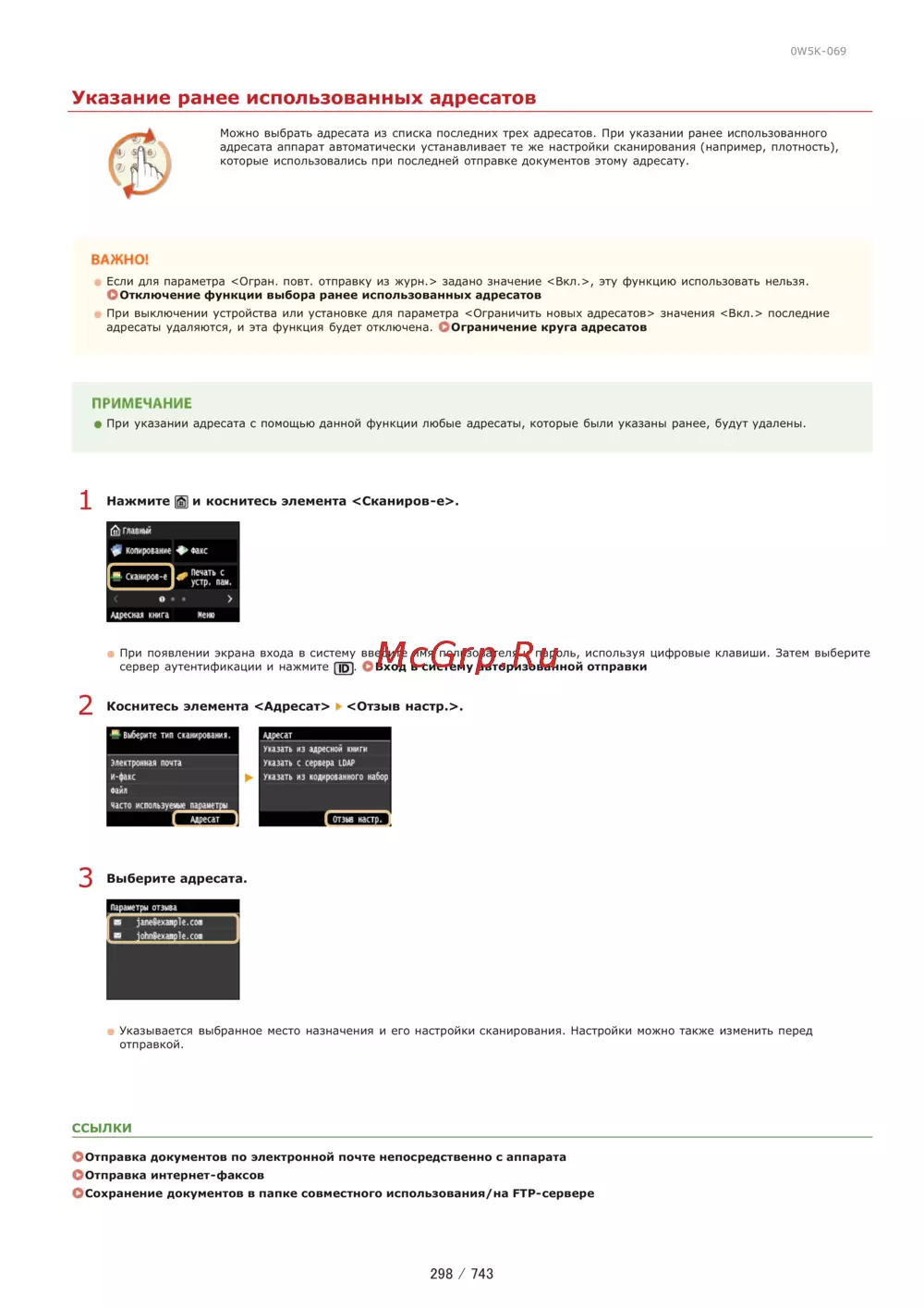 0W5K 069 Указание ранее использованных адресатов Можно выбрать адресата из списка последних трех адресатов При указании ранее использованного адресата аппарат автоматически устанавливает те же настройки сканирования например плотность которые использовались при последней отправке документов этому адресату ВАЖНО Если для параметра Огран повт отправку из журн задано значение Вкл эту функцию использовать нельзя ООтключение функции выбора ранее использованных адресатов При выключении устройства или установке для параметра Ограничить новых адресатов значения Вкл последние адресаты удаляются и эта функция будет отключена Ограничение круга адресатов ПРИМЕЧАНИЕ При указании адресата с помощью данной функции любые адресаты которые были указаны ранее будут удалены 1 Нажмите и коснитесь элемента Сканиров е й Главный ф копирование ф Факс о Адресная книга меню При появлении экрана входа в систему введите имя пользователя и пароль используя цифровые клавиши Затем выберите сервер аутентификации и нажмите Ю О Вход в систему авторизованной отправки 2 Коснитесь элемента в Выберите тип скадарования Адресат сОтзыв настр Адресат______________________________ Указать из адресной книги электронная почта Указать с сервера ЮАР И факс Указать из кодированного набор Файл часто используема параметры Адресат 3 Выберите адресата Указывается выбранное место назначения и его настройки сканирования Настройки можно также изменить перед отправкой ССЫЛКИ О Отправка документов по электронной почте непосредственно с аппарата ООтправка интернет факсов Сохранение документов в папке совместного использования на ЕТР сервере 298 743